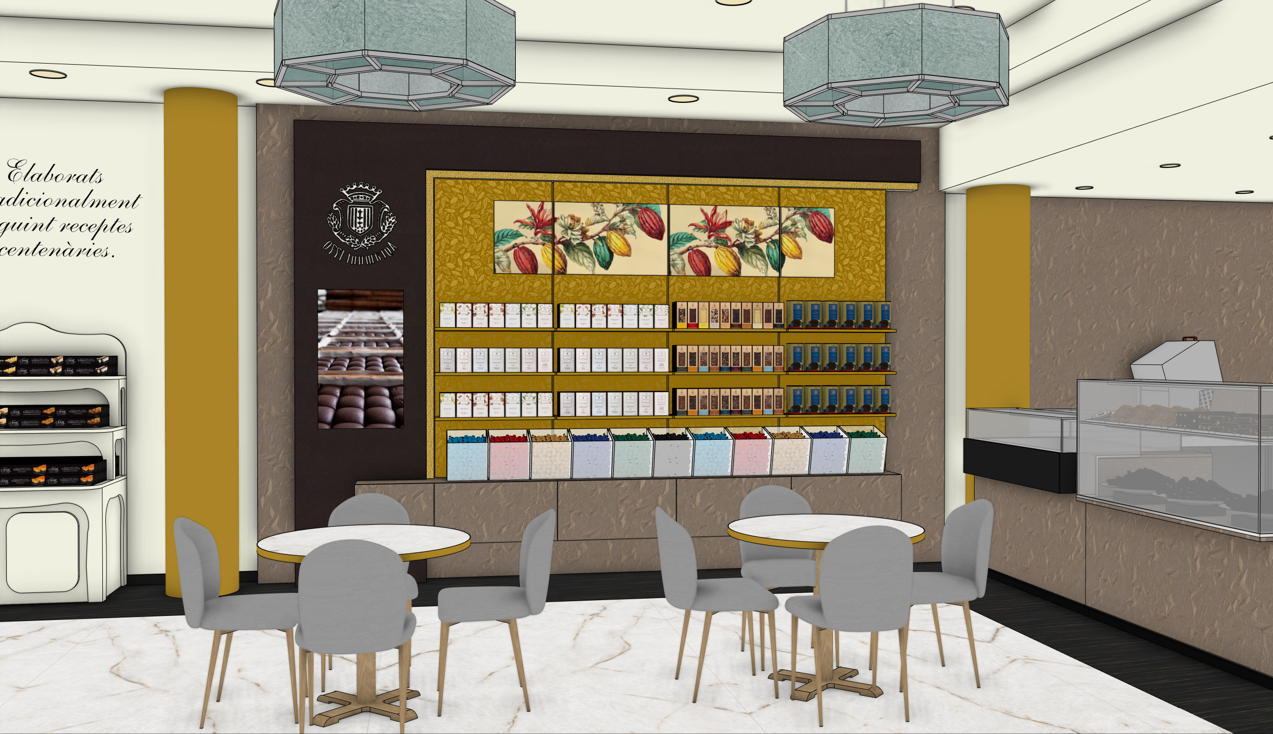 convierte la imagen en realista manteniendo mismas formas materiales y texturas las columnas son doradas mate el mueble frontal tiene la pared marr n clara y sale luz por las zonas m s claras es una chapa marr n clara perforada
