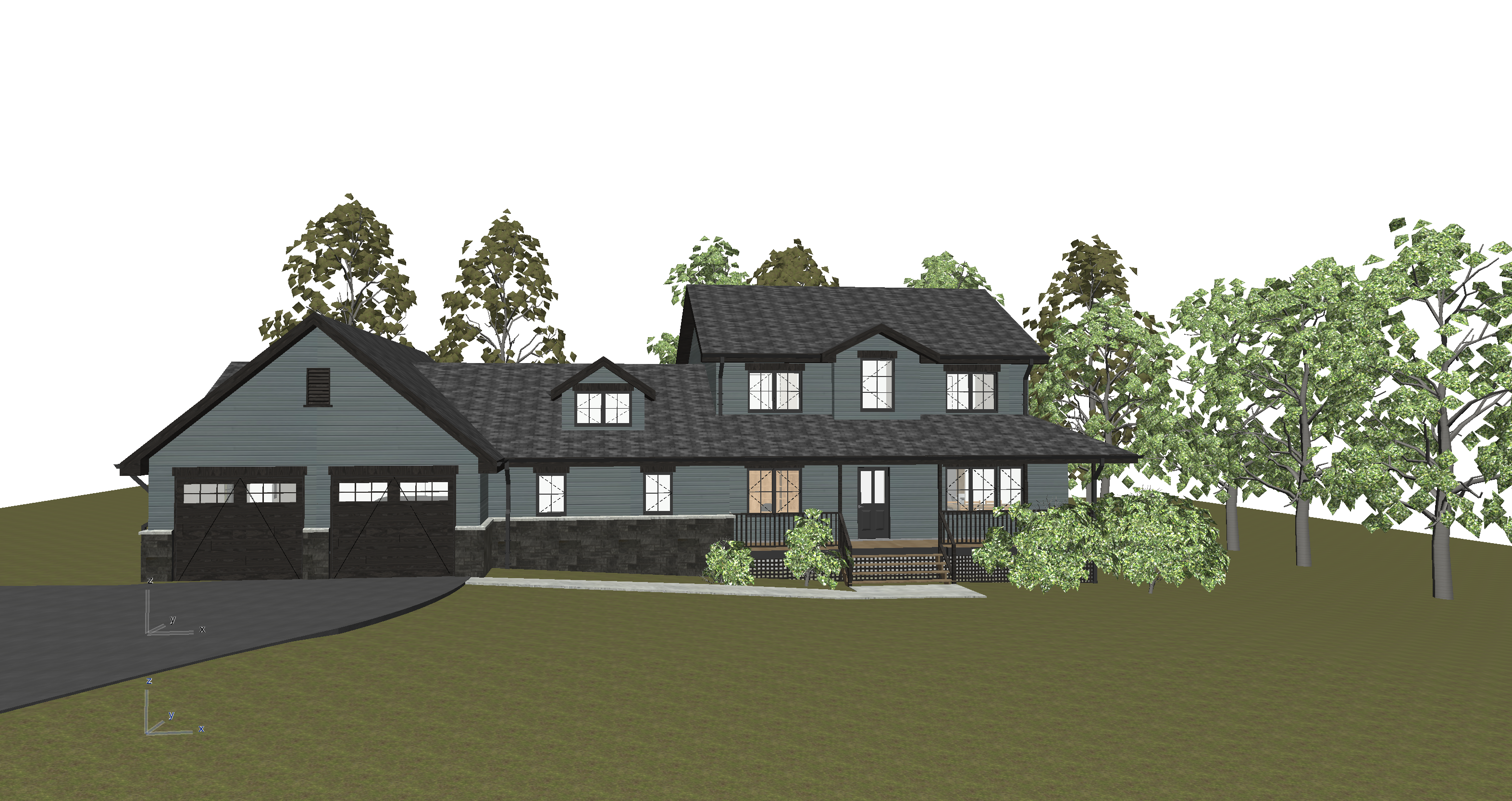 grainy watercolor rendering of home with distant tree covered mountains in the background maintain exact colors from source image