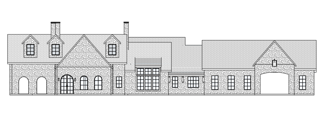 modern french country daytime lighting preserve architectural details preserve roof line creamy stone walls dark grey asphalt roof light colored fascia add detail to front gable on left and porte cochere on right add cast stone detailing on doors and windows