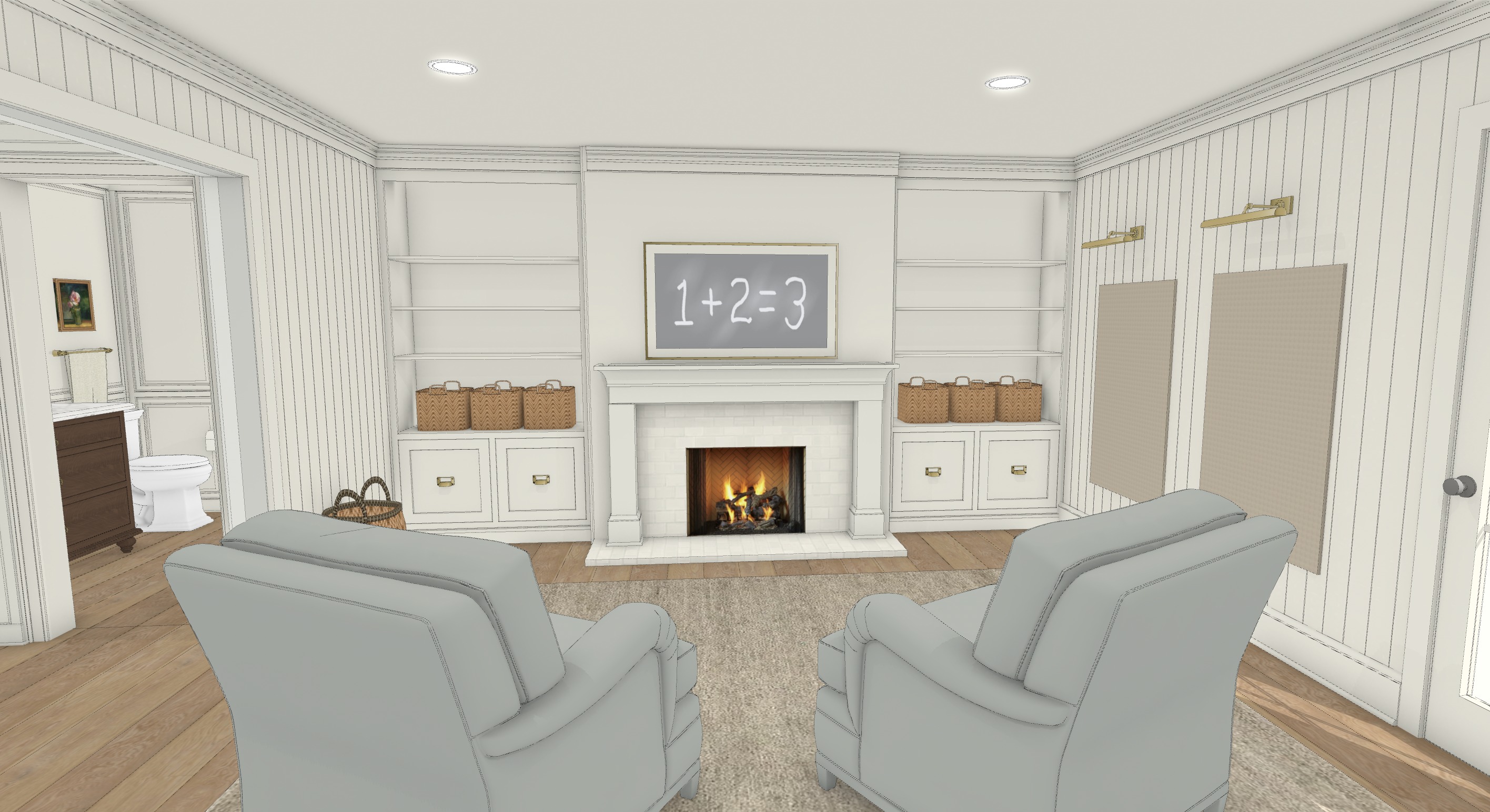 style this room like a playroom add toys to the shelving keep the chairs a light dusty pale blue
