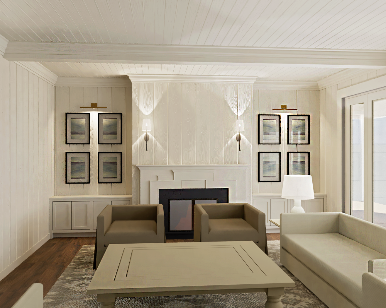 chairs are a brown neutral linen sofa is a white linen coffee table is a rustic pine add coffee table books to table art is vintage audobon prints