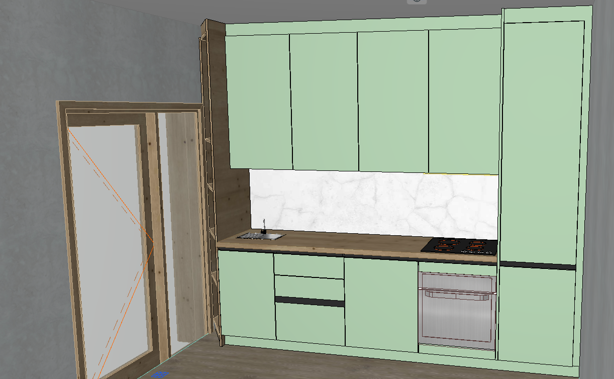 transform this archicad kitchen into a highly realistic photorealistic render while strictly preserving the original layout cabinet design dimensions appliances placement and all architectural details do not redesign do not add new elements and do not change the composition keep everything exactly as modeled only enhance realism the kitchen cabinets should remain a light soft green color elegant and modern preserve the original worktop furniture structure and all details exactly as in the model use realistic pbr materials natural wood or stone textures where already present accurate reflections subtle imperfections soft shadows balanced global illumination and realistic natural daylight maintain clean edges correct proportions and all fine lines from the original project the final result must look like a real photographed kitchen not a cgi redesign not a concept variation and not a different project