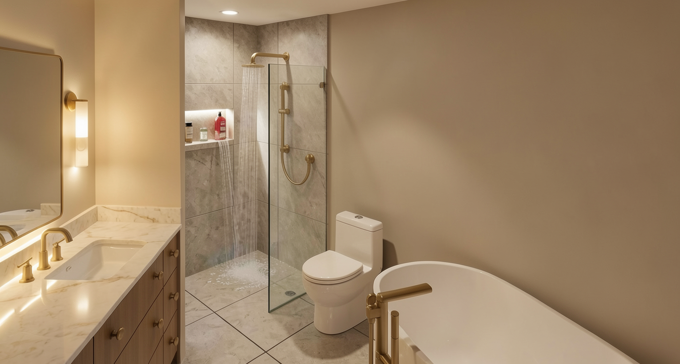 rustic modern boho bathroom with beige tile floors and vertical wood slat tile on shower walls and tub surround lower walls
