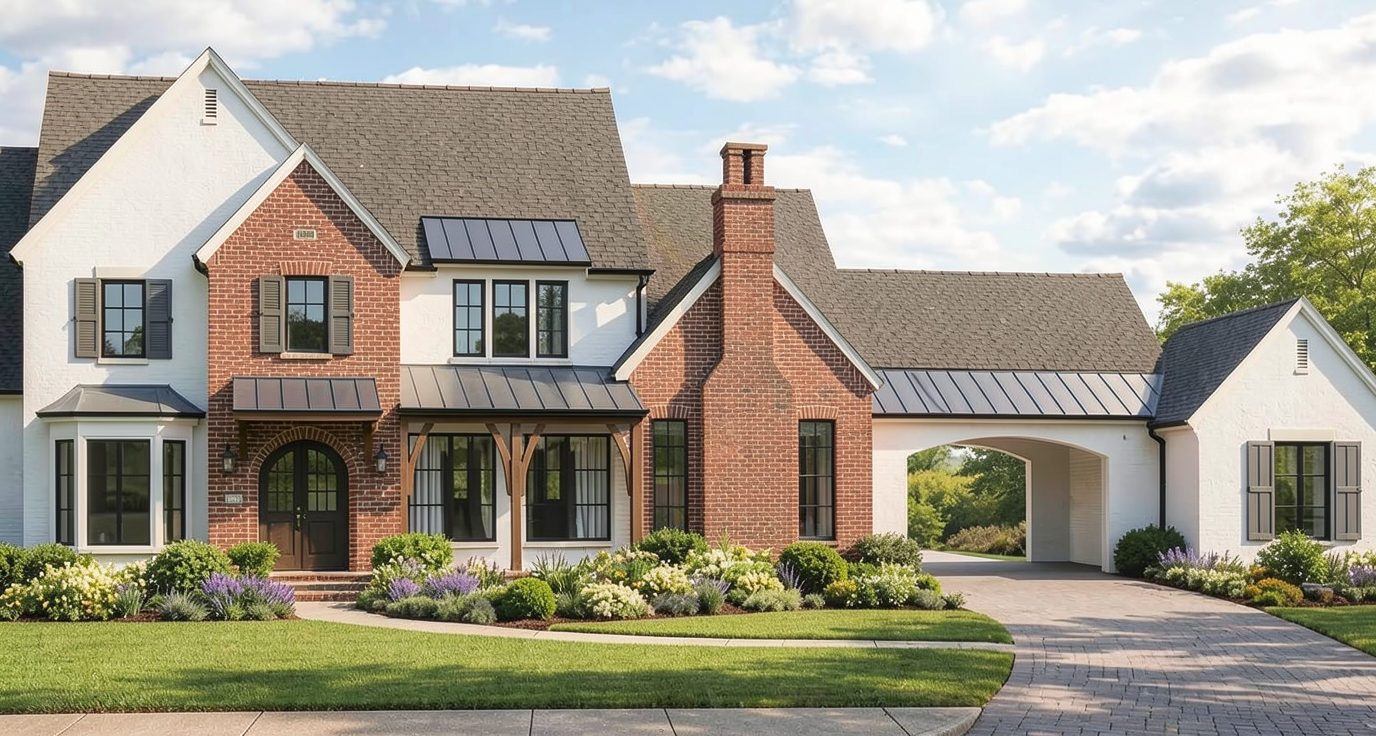 use white brick and cedar shake roof with metal over front porch and white columns