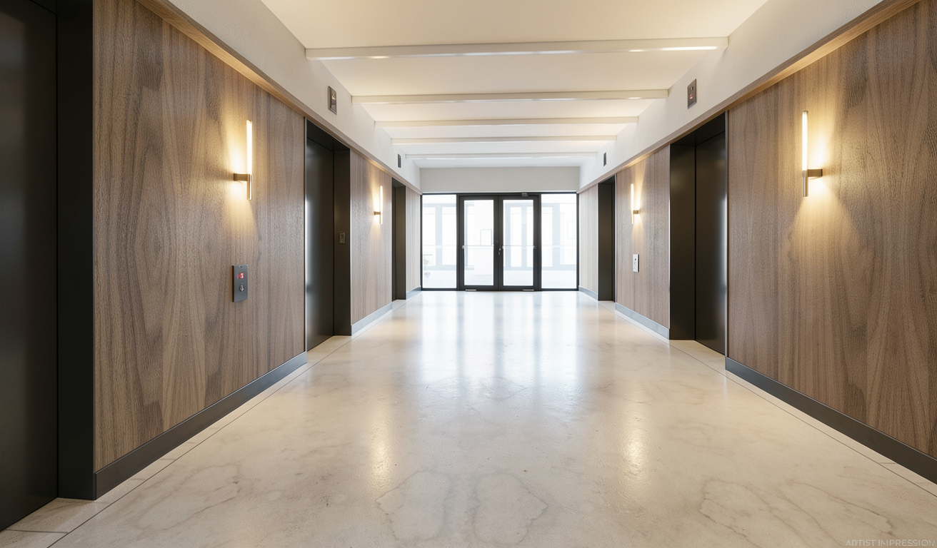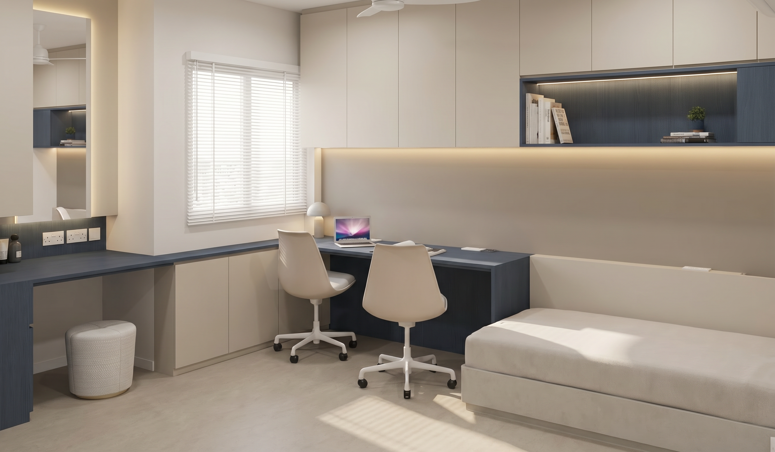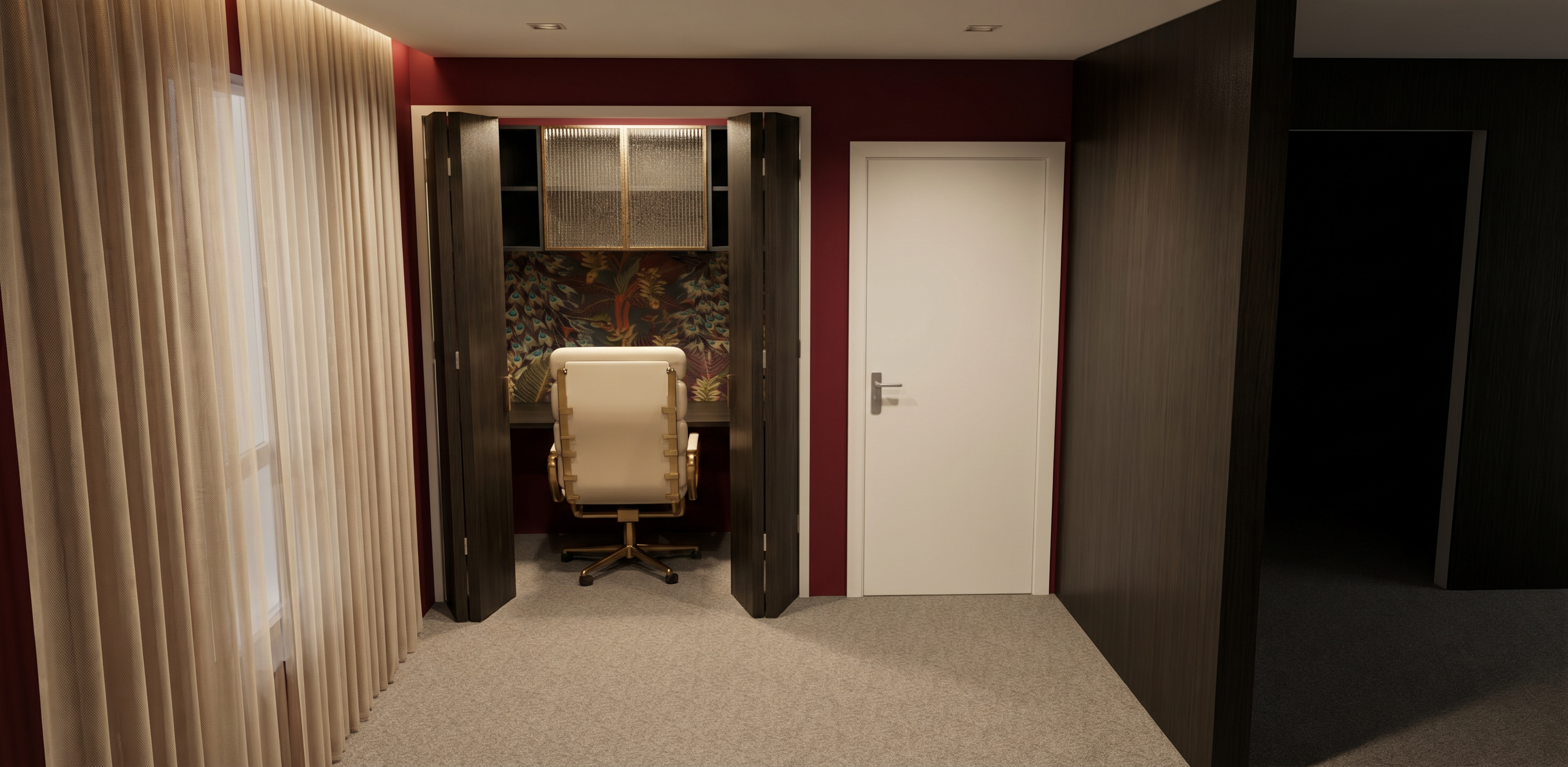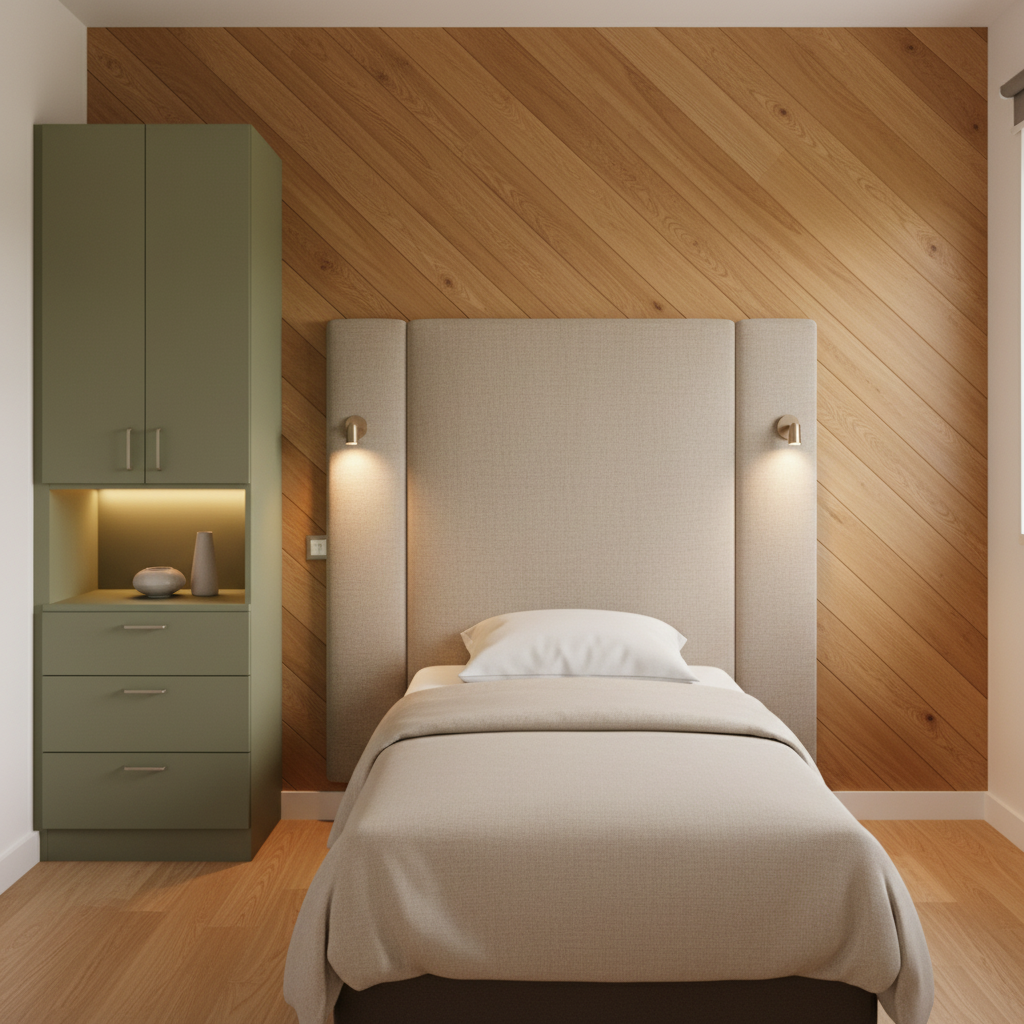 photo realistic bedroom render timber wall panels in diagonal timber grain and upholster bedhead full height wall lights matching timber cupboard to side with open shelf in olive green use single bed suitable for aged care