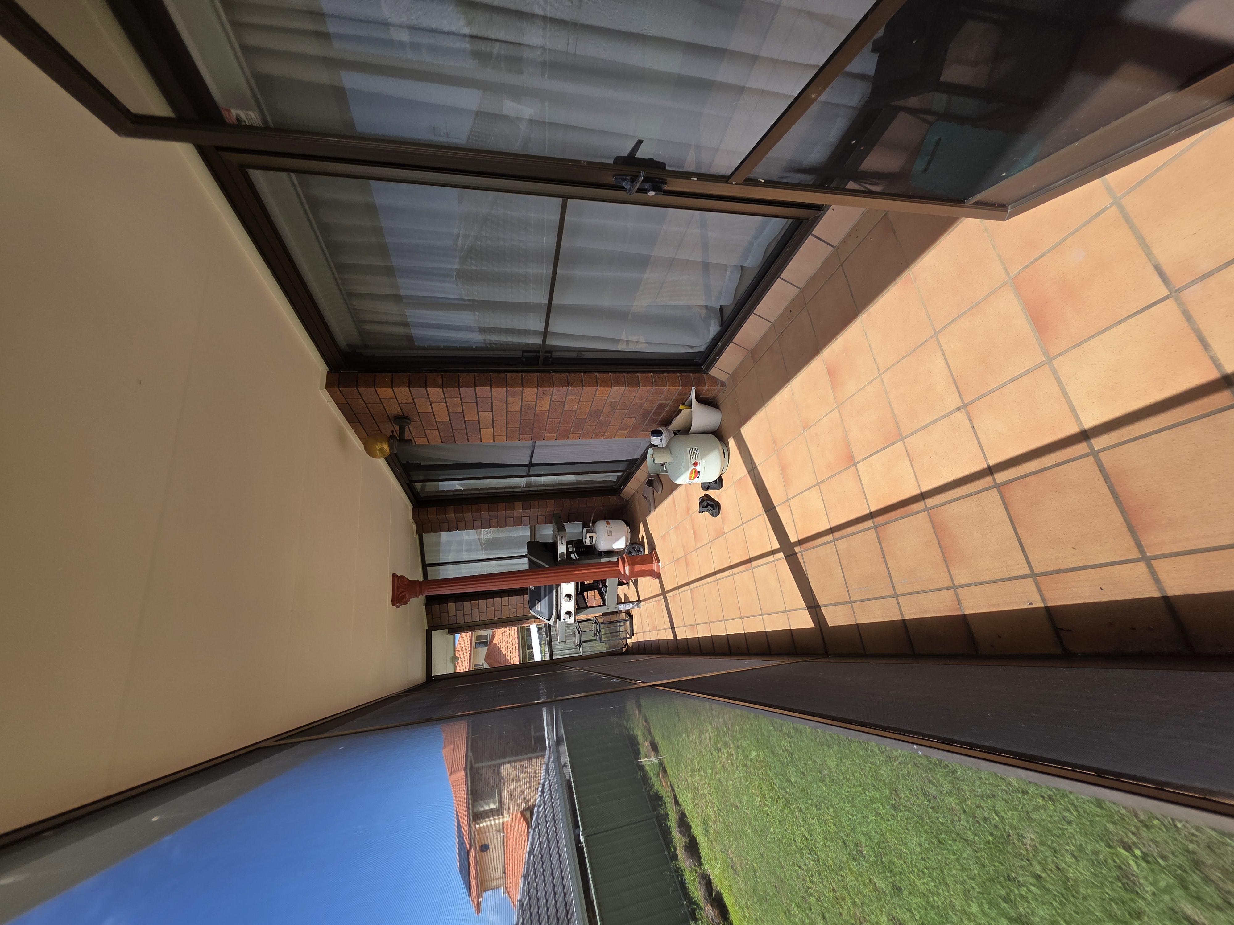remove the screen fly door and open the whole area up add in a modern bbq and replace the old one and add in a glass fence along the patio as the poool will go infront make this very moden with white and beige colour scheme
