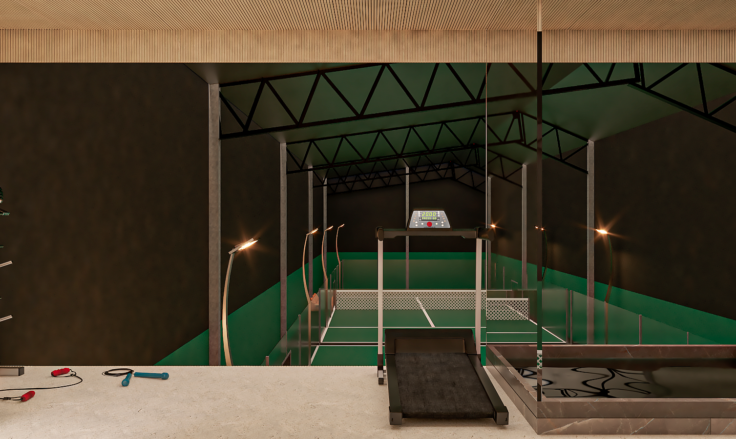 ultra realistic architectural rendering of an indoor tennis court with intense artificial lighting to create a bright and evenly illuminated environment maintain all architectural and material characteristics of the original court including textures proportions and surface details the tennis net must look realistic with accurate mesh texture tension and light interaction the lighting should emphasize realistic reflections shadows and material depth ensuring a highly detailed and photorealistic result