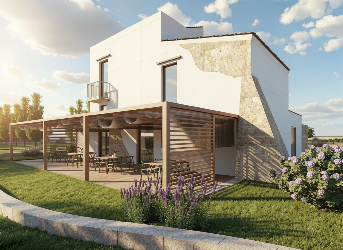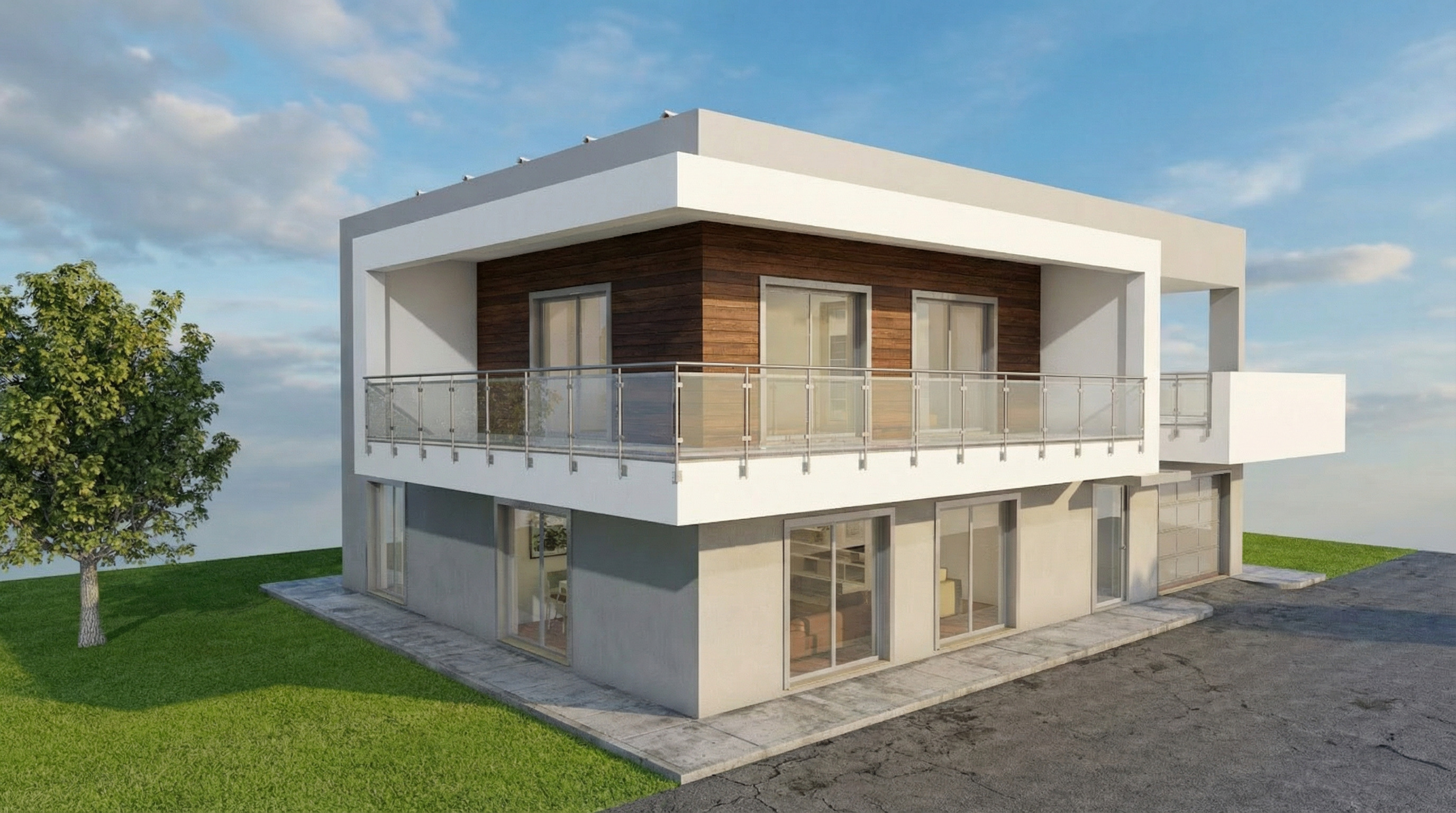 contemporary residential building extension matching existing modern architecture cubic volumes with flat roof white plaster facade combined with horizontal wood cladding large glass windows and sliding doors glass balustrades on balconies clean minimalist design same proportions and materials as the main building seamless architectural continuity suburban residential context with green lawns and trees soft daylight realistic shadows ultra realistic architectural visualization high detail wide angle view human scale