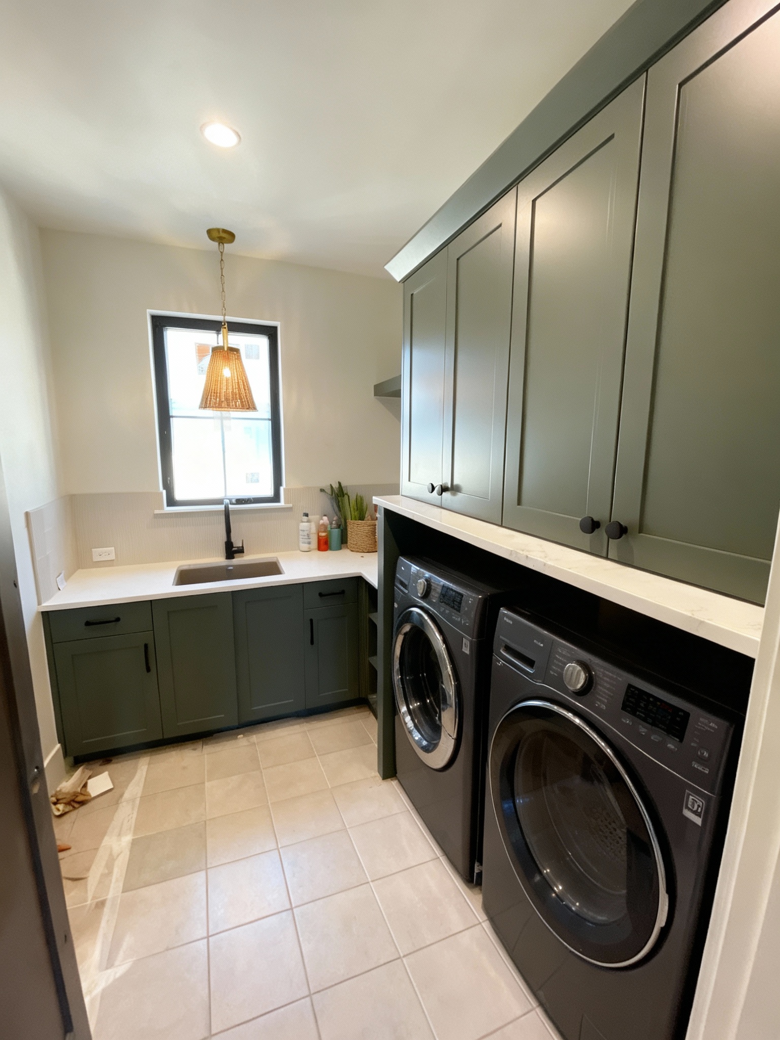 clean up the flooring of construction materials add fun modern tile add a washer and dryer stage the laundry room
