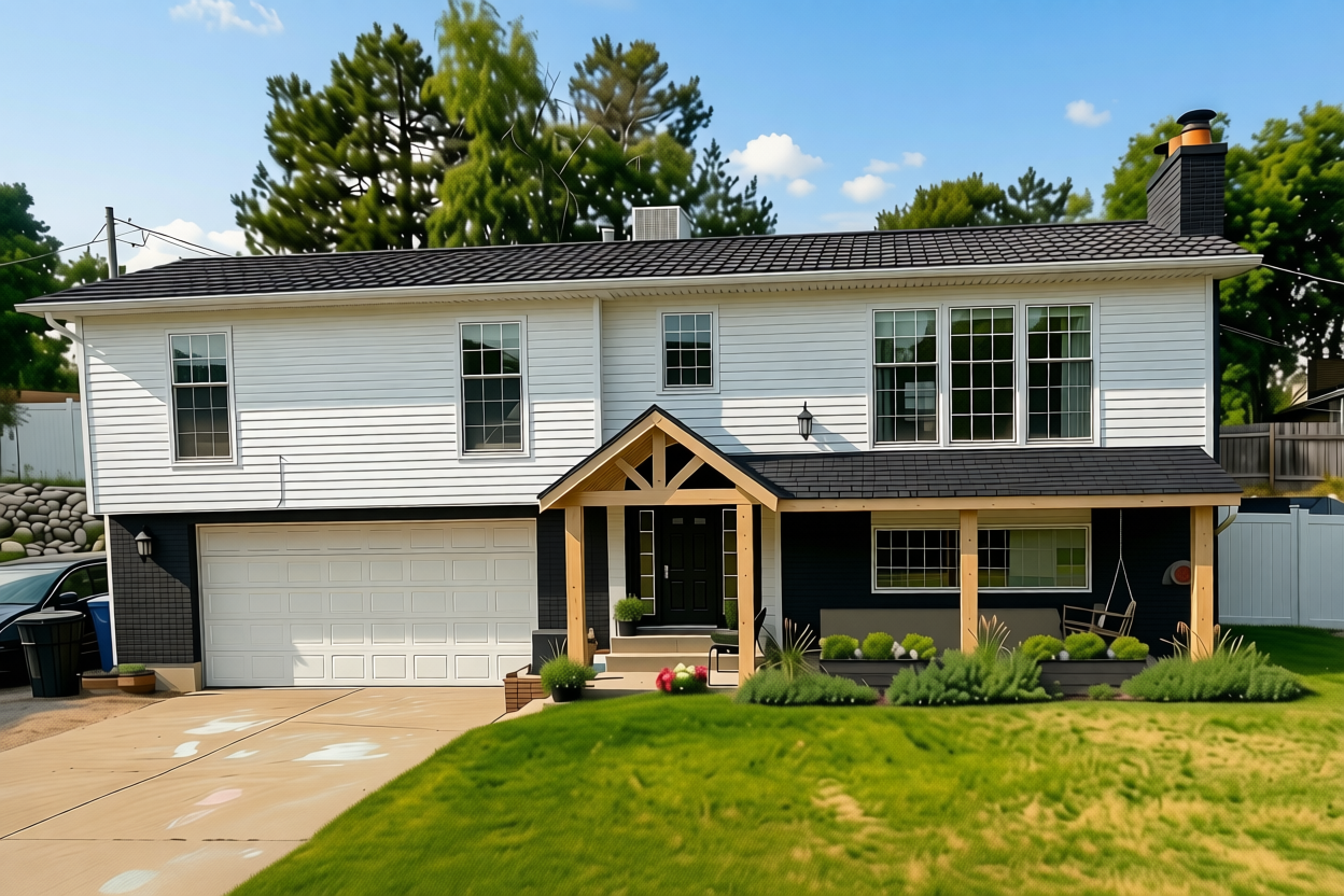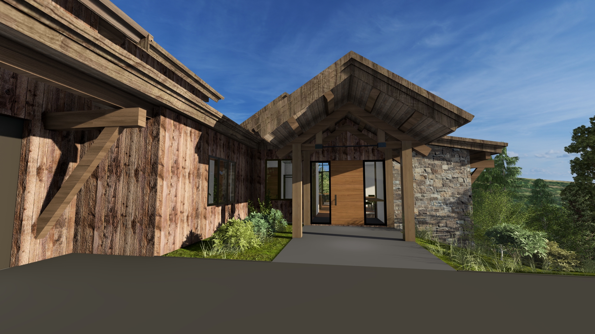 vertical warm wood natural siding with subtle grain depth micro relief only no exaggerated grooves winter color balance direct winter sun physically accurate roughness variation deep natural snow coverage everywhere except on driveway