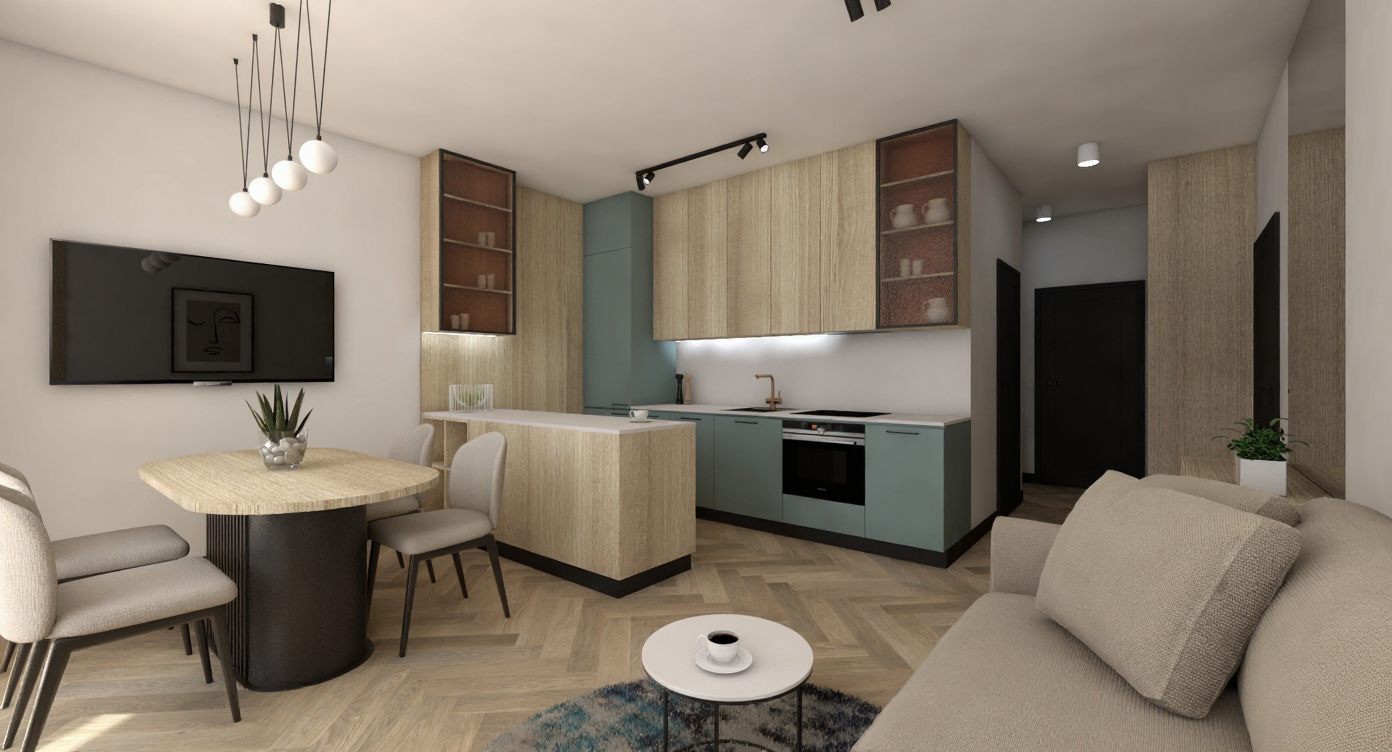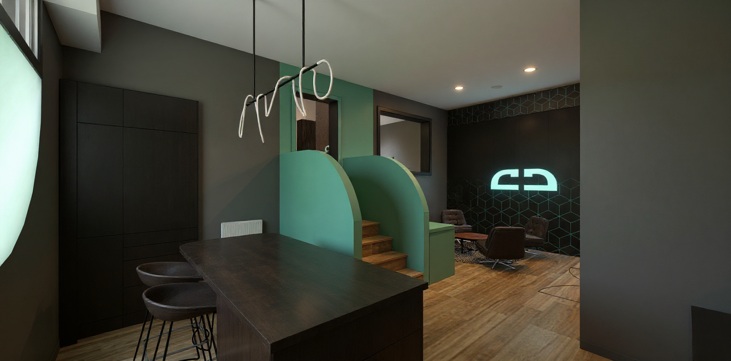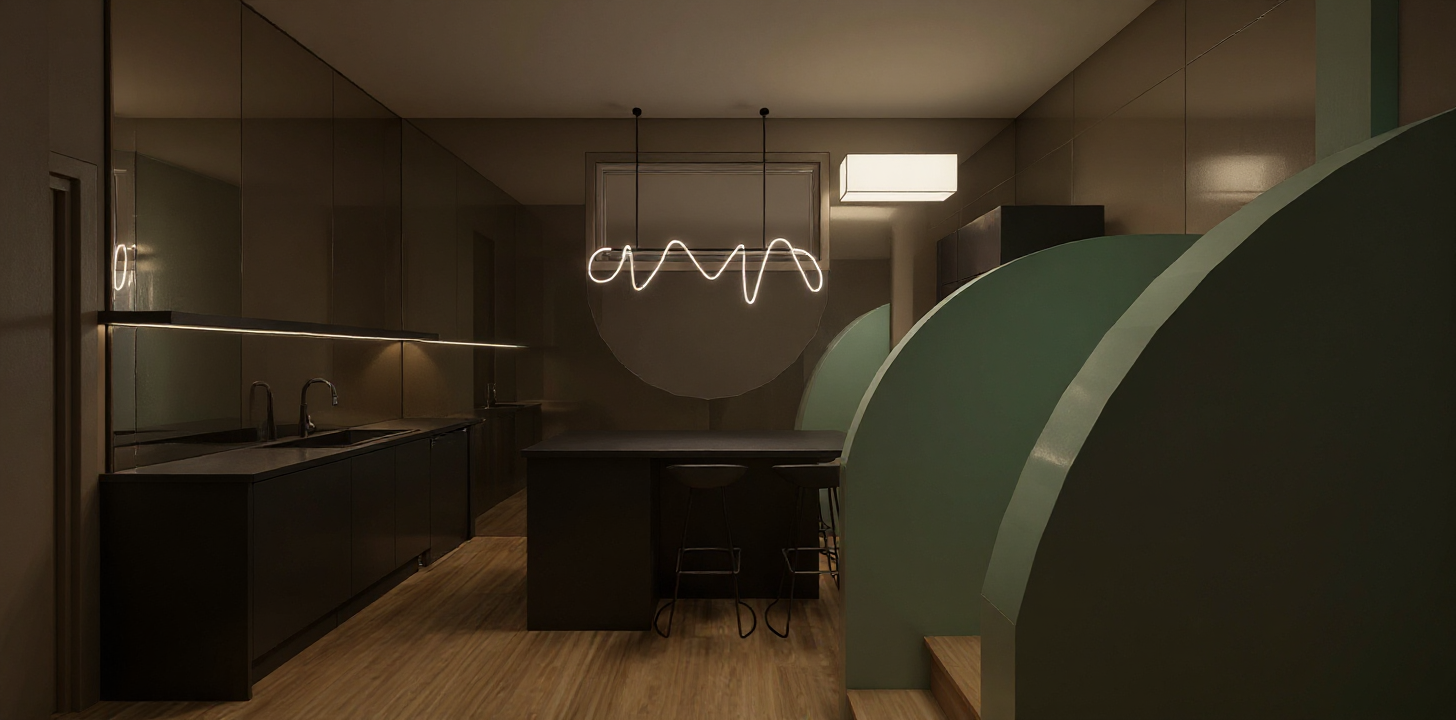 interior render left wall paneling is waved corrugated black metal under the window is a half moon green mirror please light the led pendant on top of the island
