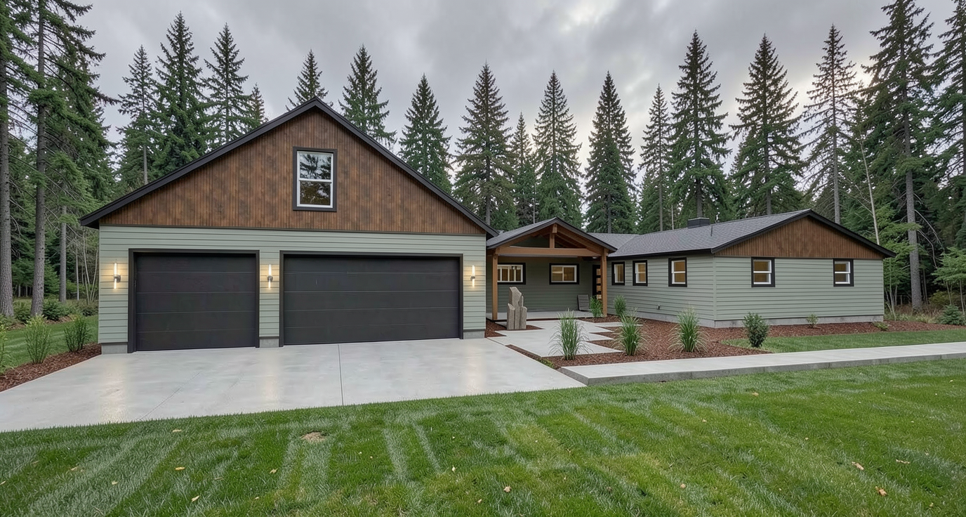 modern cabin in the boreal forest create a gravel parking lot in front of the house