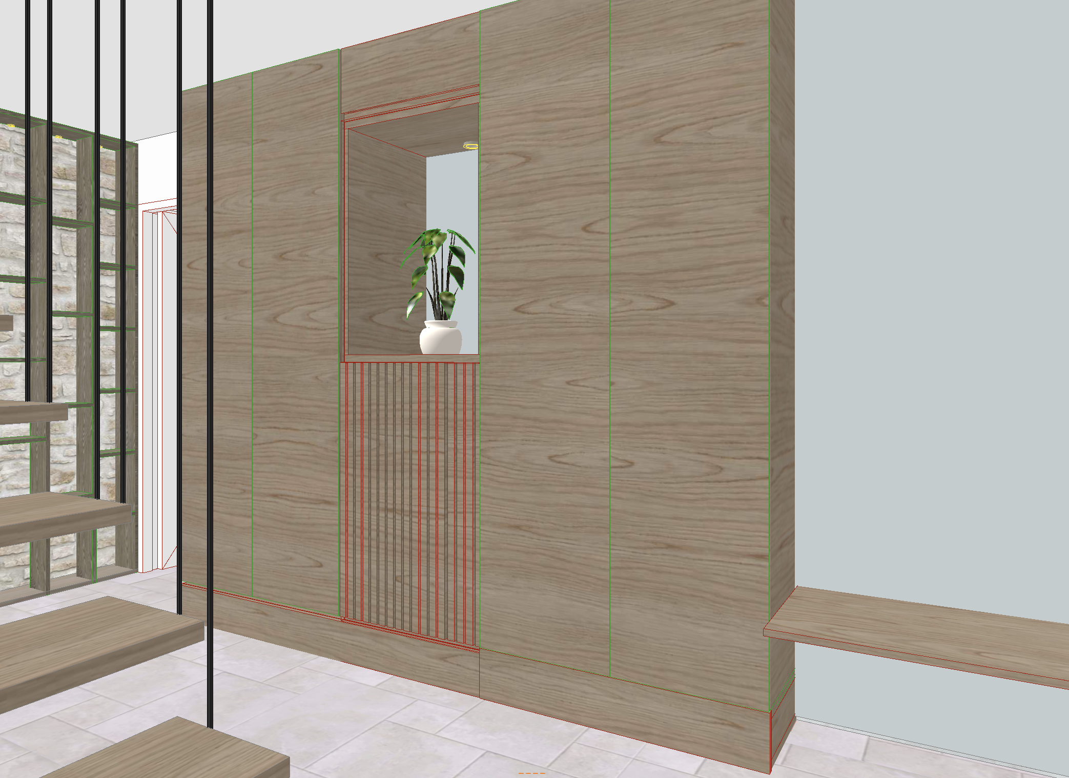 render a modern interior stairway setting with a floating staircase featuring light oak wood steps and sleek black metal railings the wall is covered in mirror from side to side floor to ceiling with a bench crossing in front of it providing a clean minimalist look the door is white complementing the understated aesthetic include a right side wall with textured light wood panels adding depth and contrast the floor is a light grey marble with gentle veining the atmosphere is airy and contemporary with soft natural lighting that enhances the space s elegance and simplicity
