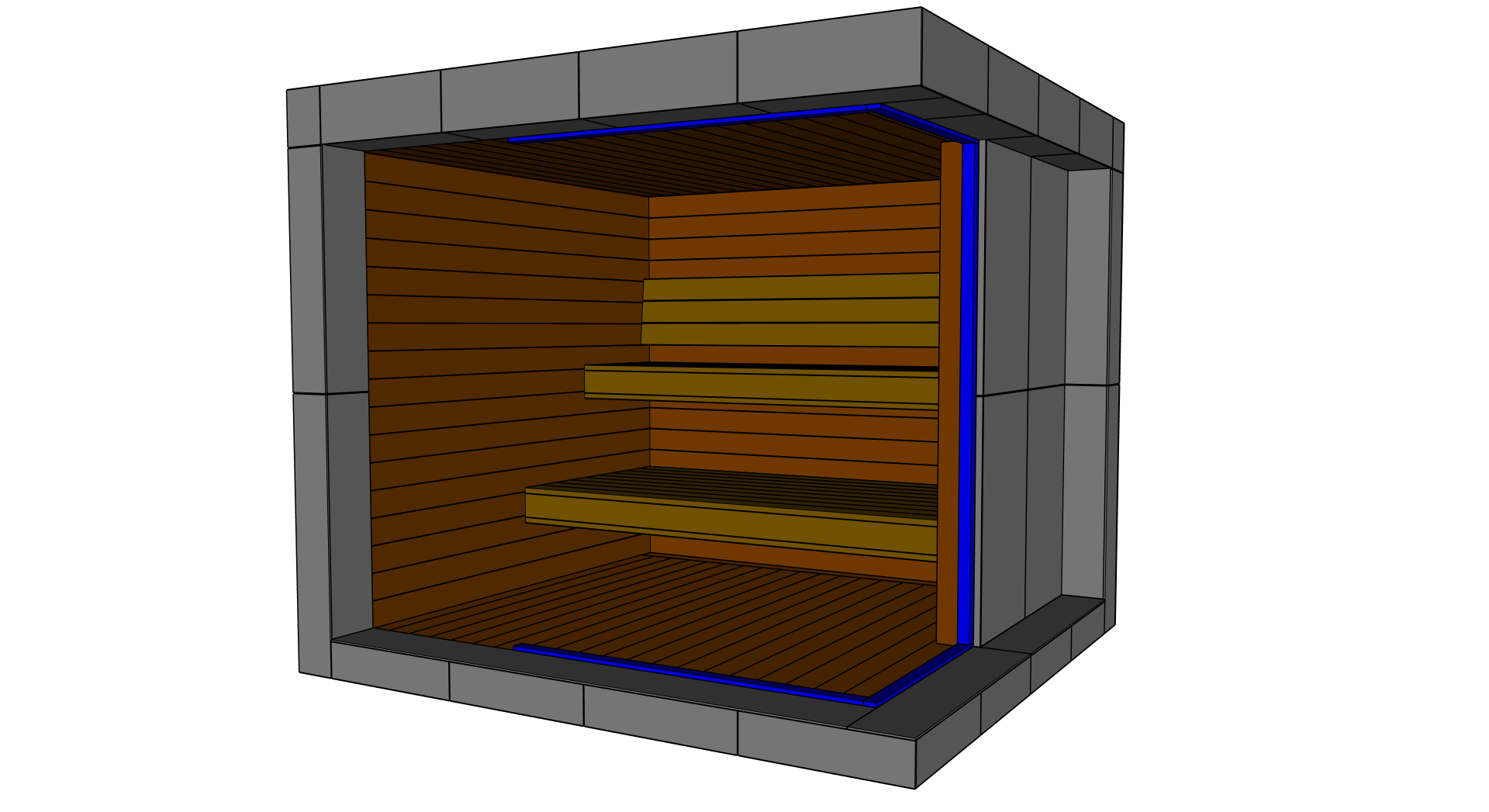 photorealistic archviz render image to image of a kubiq eclipse black sauna module based strictly on the provided workshop sketchup drawing lock geometry keep the exact shape proportions panel segmentation edges openings wall thickness and camera angle perspective identical to the input do not move add remove or resize any elements style materials eclipse black exterior cladding premium matte black facade fundermax compact deep matte black facade panels subtle realistic 5 mm seams crisp panel edges clean premium finish interior premium sauna wood with horizontal boards approx 120 mm wide warm tone thermo alder hemlock feel realistic grain clean joints ceiling floor matching slatted wood straight alignment consistent spacing lighting signature detail recessed led strip in a concealed channel around the ceiling perimeter and around the floor perimeter creating a floating effect lighting should be premium and realistic soft bounce gentle shadows slight glow bleed on nearby surfaces no overexposure scene neutral studio background clean minimal no environment soft controlled lighting high realism sharp details 8k look professional product visualization no people no logos no extra props no additional windows doors