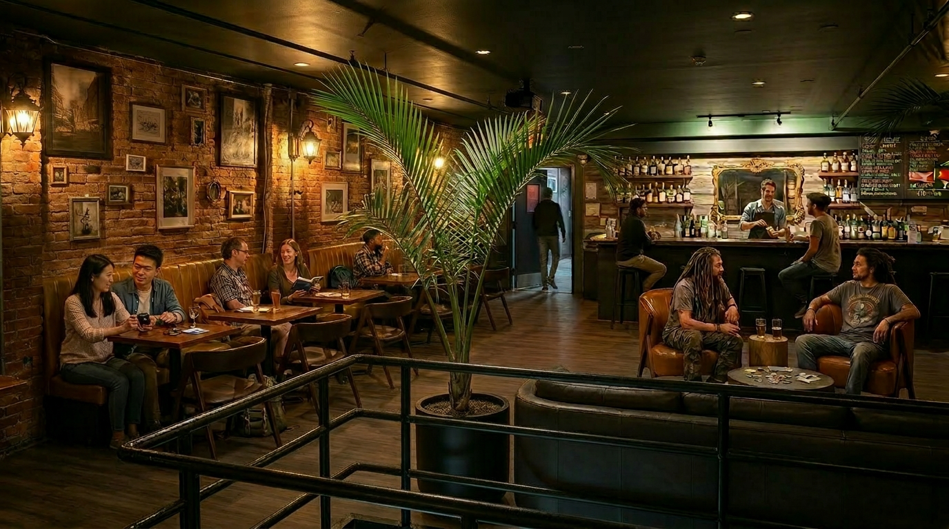 a cozy and inviting indoor bar setting with a warm and rustic atmosphere the walls are exposed brick with an array of framed vintage art and soft golden light emanating from classic wall sconces rich brown leather booths and wooden tables create a welcoming seating area a large healthy green potted palm adds a tropical touch contrasting the warm tones the bar is adorned with a wooden counter surrounded by patrons seated on tall stools with a bartender mixing drinks the overall ambiance is lively yet relaxed with soft lighting enhancing the intimate and communal vibe color palette warm browns deep greens soft golds and rich wooden tones
