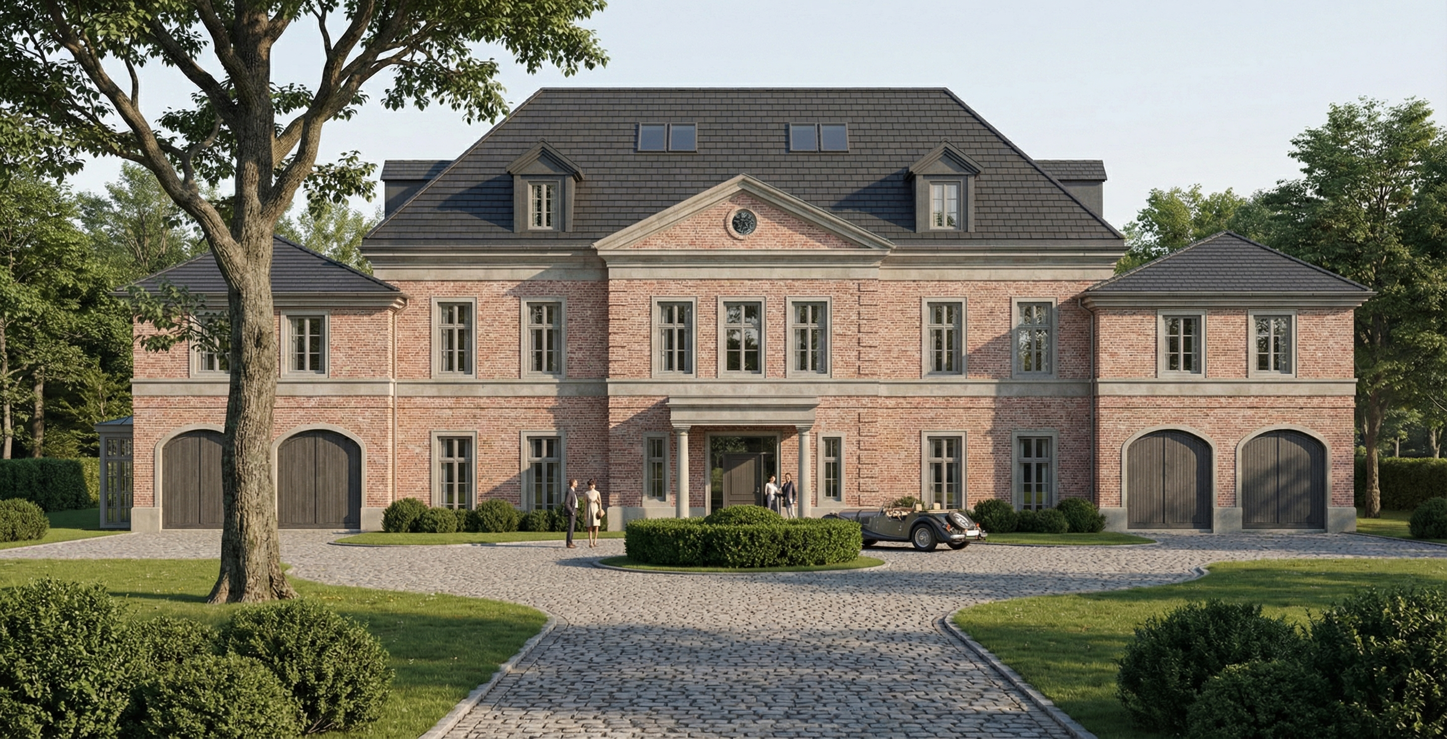create a highly photorealistic eye level exterior rendering of this two story traditional home maintain the exact architectural design rooflines window placement shutters trim details and proportions as shown in the reference image do not change the layout materials or colors the home features painted white brick warm medium brown asphalt shingle roofing soft blue gray shutters natural stained wood porch posts and brackets and a stained wood front door preserve all siding textures brick coursing roof shingle variation and trim profiles exactly as shown driveway should be on the far right side of house with a sidewalk that extends in front of the house to the front door landscaping against the house should be full with bushes and flowers wood columns and beams should be rustic in nature painted shake siding should be shown where indicated on the seed drawing lighting should be natural late afternoon golden hour sunlight with soft warm highlights and gentle shadows to emphasize depth and architectural details add realistic sky with soft clouds subtle ambient light bounce and accurate shadow direction enhance realism with subtle brick texture variation and mortar depth realistic glass reflections in windows sky trees environment slight imperfections in wood grain and natural stain variation soft landscape integration with realistic grass foundation planting and minimal shrubs similar in scale to the reference natural concrete texture on porch slabs and steps accurate shadowing beneath eaves and porch roofs camera settings eye level perspective approximately 5 6 feet above ground 35mm architectural lens equivalent balanced exposure crisp detail high dynamic range ultra high resolution 8k quality professional architectural photography style surround the home with a subtle natural residential setting mature trees in the distance soft lawn grading consistent with the reference terrain but keep the focus on the architecture the final image should look like a professional real estate twilight golden hour photograph not a stylized illustration or cgi drawing