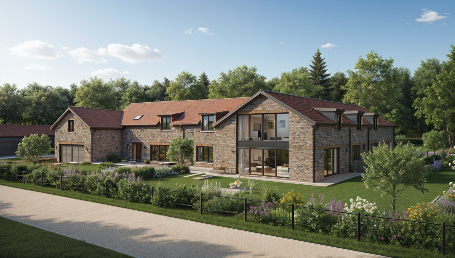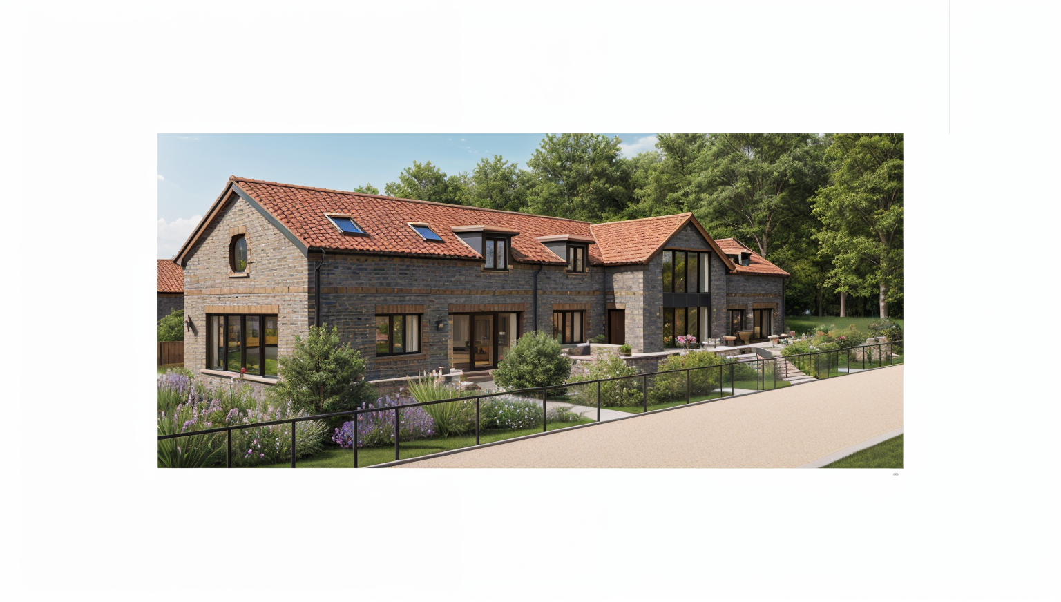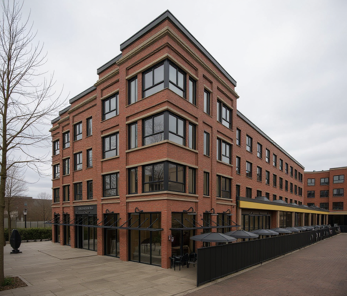 black iron spot brick restaurant on the first floor black window and door framing