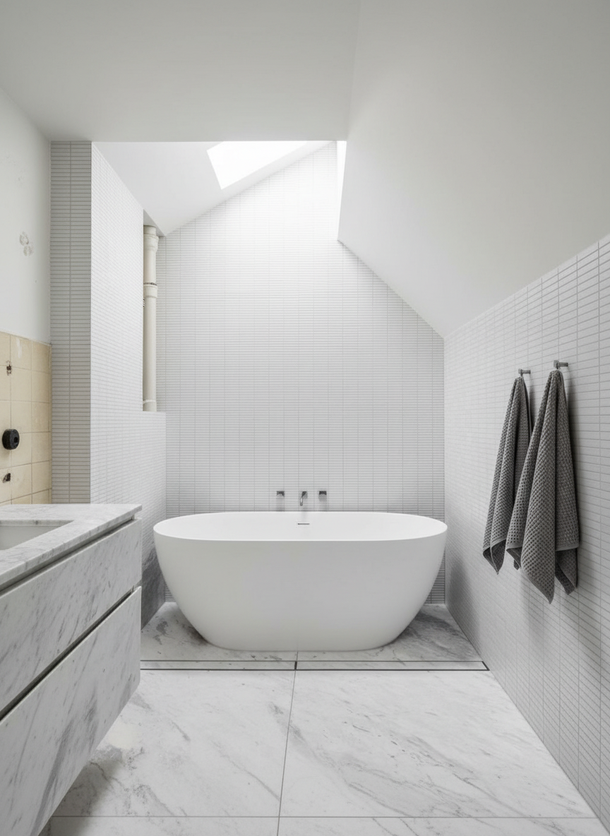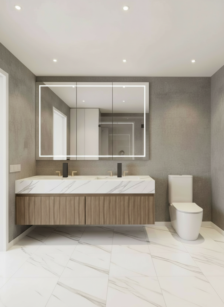 mirror with white glass edge thin vertical 3d wood slat tiles in shower light scones have no shine vanity light scones are matte white glass turn vanity light and ceiling recessed light on at 3000k ceiling light does not appear on image but we need the light source