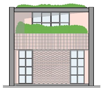 black exposed metal steel work from with red brick work infill gravel parking to the front and close boarded fence to either side perforated brick to ground floor middel panel no concrete plinth