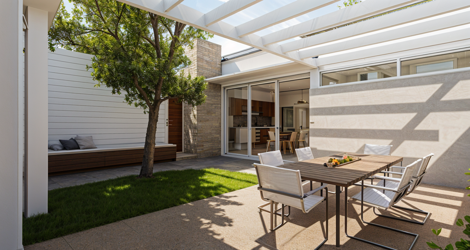 midday sun micro cement feature wall exposed aggregate external paving add large tree in courtyard add cushions back bench increase light within courtyard