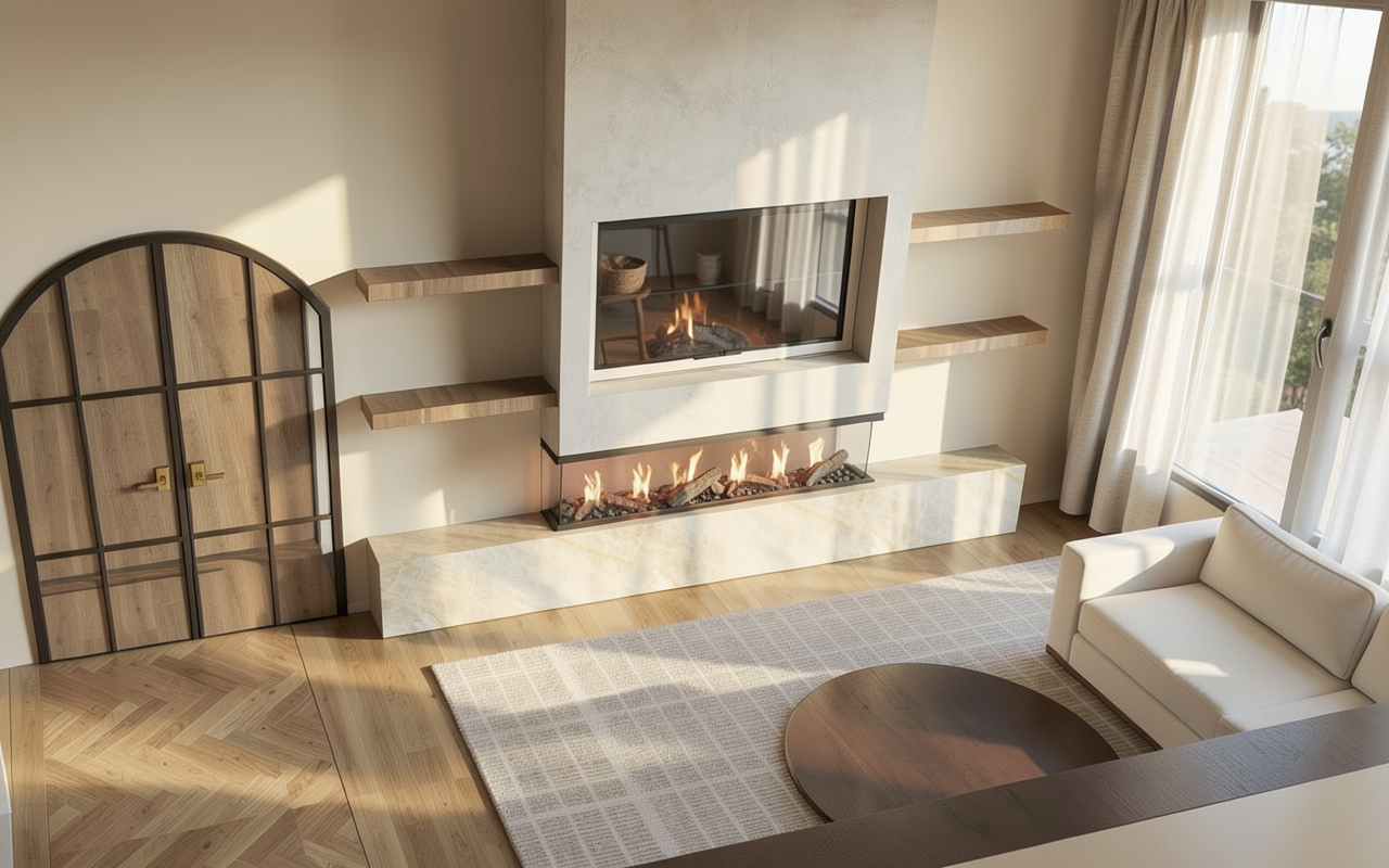 convert this floor plan into a realistic isometric 3d view of a full house show the space from an elevated angle with furniture walls and details visible isometric top down view of an outdoor pergola space only not an enclosed building the structure is an open air modern pergola with a matte black frame and visible posts and beams there are no walls no enclosed rooms and no interior architecture inside the pergola place a clean l shaped outdoor kitchen island the island is made of smooth coastal microcement in a warm white tone has a sculptural built in look with open niche shelving has no cabinet doors and no traditional kitchen cabinetry sits fully inside the pergola posts with open space around it layout 5 ft grill centered on the main run pizza oven on the left side sink on the vertical leg single level countertop with seating overhang on inner sides only environment open outdoor patio floor stone or concrete no walls no interior rooms no hallways no random partitions or dividers no enclosed walkways style minimal mediterranean coastal architectural soft shadows natural light clean uncluttered important this is an outdoor structure not a house do not add walls doors windows or interior room divisions use the same furniture as shows on the plan do not change the orientation of the floorplan