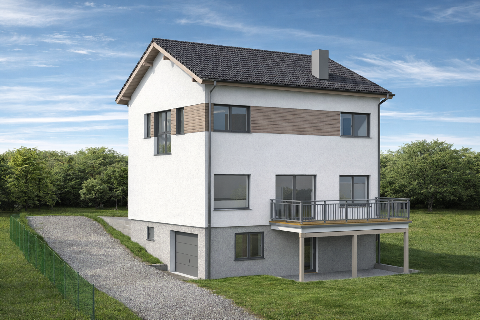 visualisiere das geb ude fotorealistisch belasse die geb udeform exakt gleich die materialbelegung bzw farbe soll ebenfalls bleiben nur fotorealistisch dargestellt werden das angedeutete gel nde soll ebenfalls so ausgef hrt und an die umbegung angepasst werden
