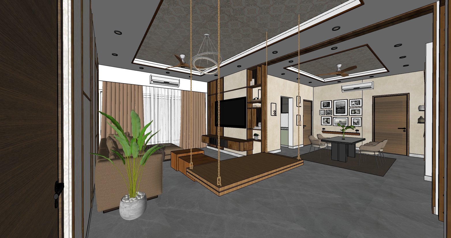 create a realistic interior render showcasing the existing furniture and flooring with their original textures preserved exactly as provided integrate cove lighting within the ceiling to produce a soft ambient glow that enhances the overall atmosphere ensure the ceiling cove lights are realistically illuminated casting appropriate shadows and reflections on surrounding surfaces maintain accurate material properties for all elements including fabric wood metal and flooring finishes to achieve a high fidelity photorealistic result adjust light intensity and color temperature for a balanced warm and natural lighting composition without overexposure