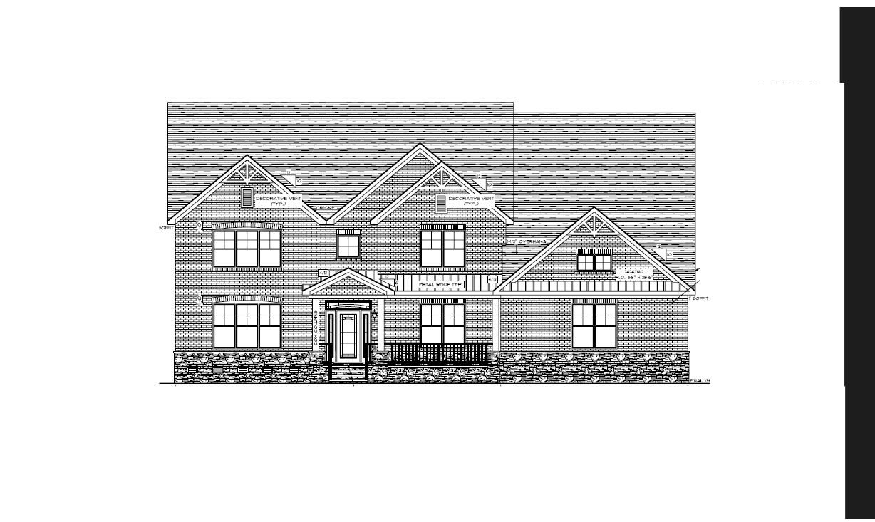 make as photorealistic as possible while keeping textures the same as selection professional landscaping in a lightly wooded scene with good lighting match materials to plan tan brick per plan light stone per plan white gutters white windows white trim weatherwood roof stained gable trim matte black porch roof stained porch columns