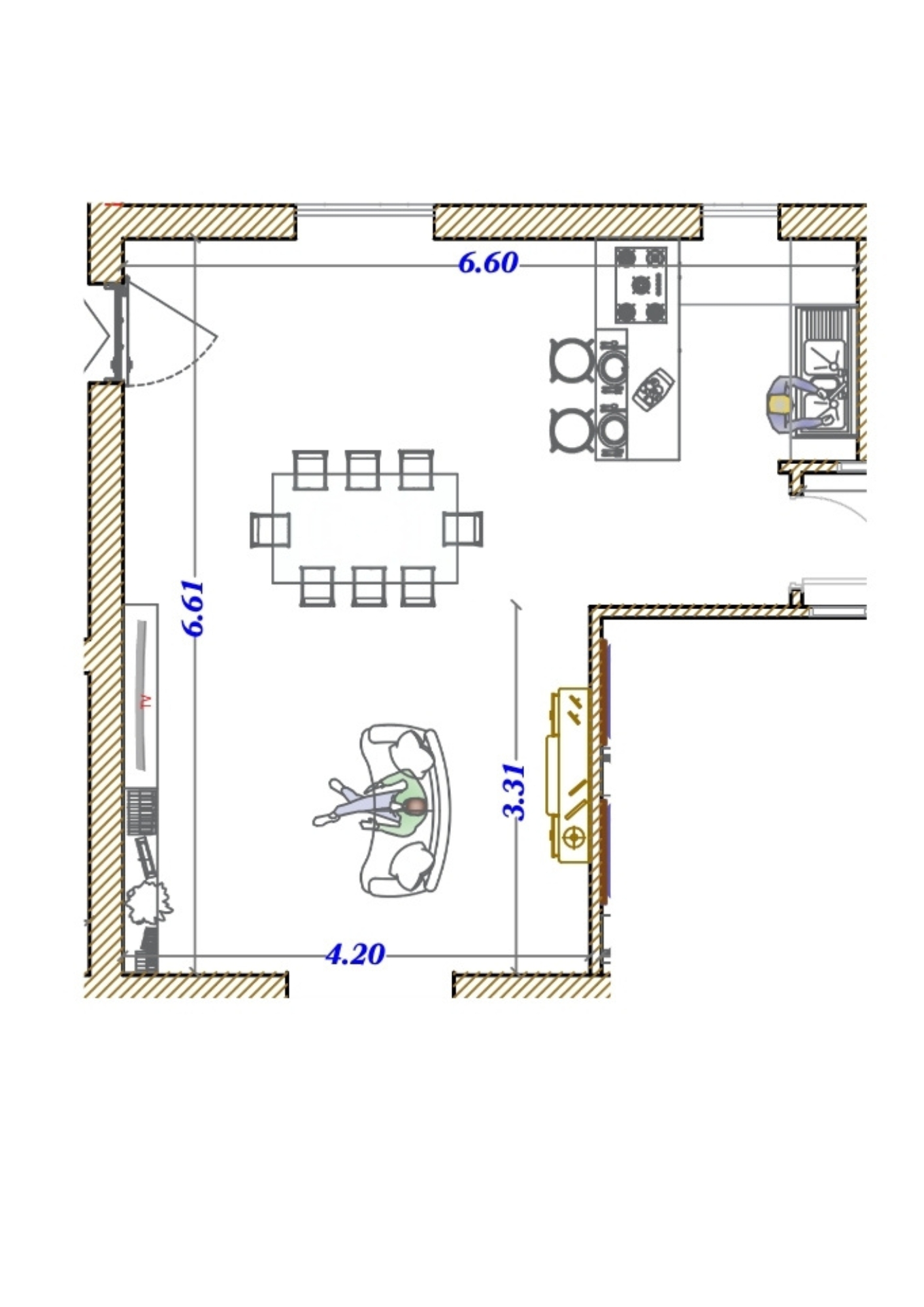 modernist interior shot soggiorno open space moderno con cucina rispettando la planimetria divano frontale con tv sulla parete sinistra tavolo da pranzo centrale con 6 sedie cucina lineare con isola e sgabelli stile moderno elegante pavimento in legno luce naturale dalle finestre fotografia d interni ultra realistico 4k wide angle forza 80 architecture