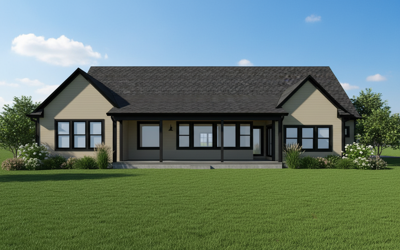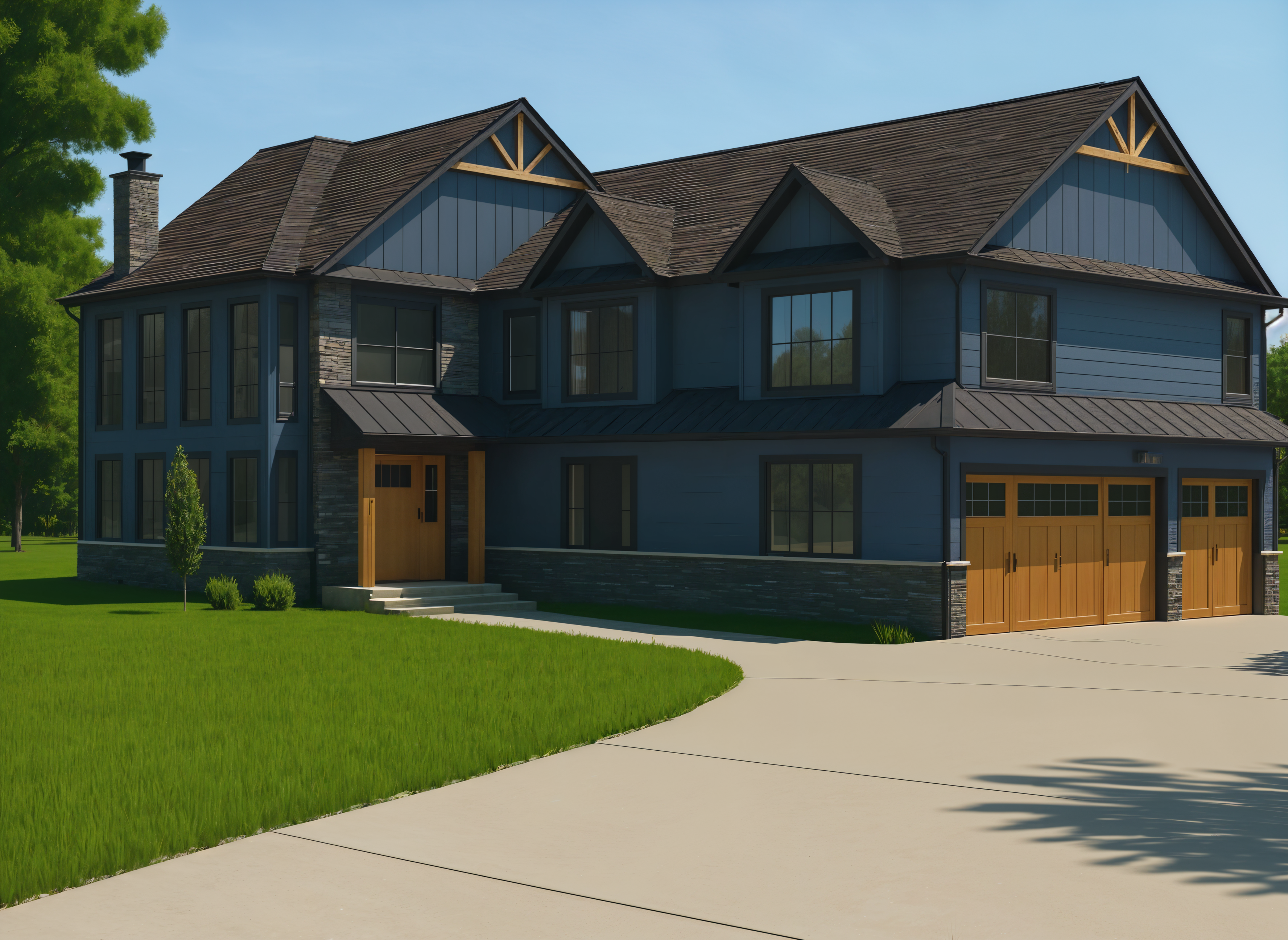 siding to be color dark grey blue 2b2b48 all wood to be same color brown wood garage doors to look modern