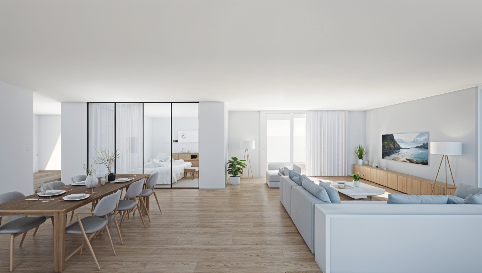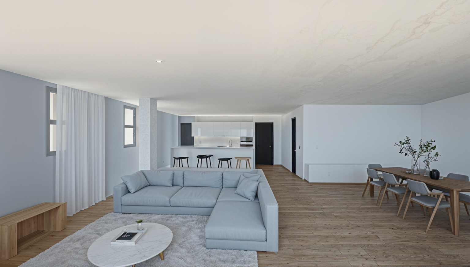make a realistic 3d image of this modern flat light wood flooring and and white furniture make the right hand side corner wall in natural stone add a tv in front of the sofa