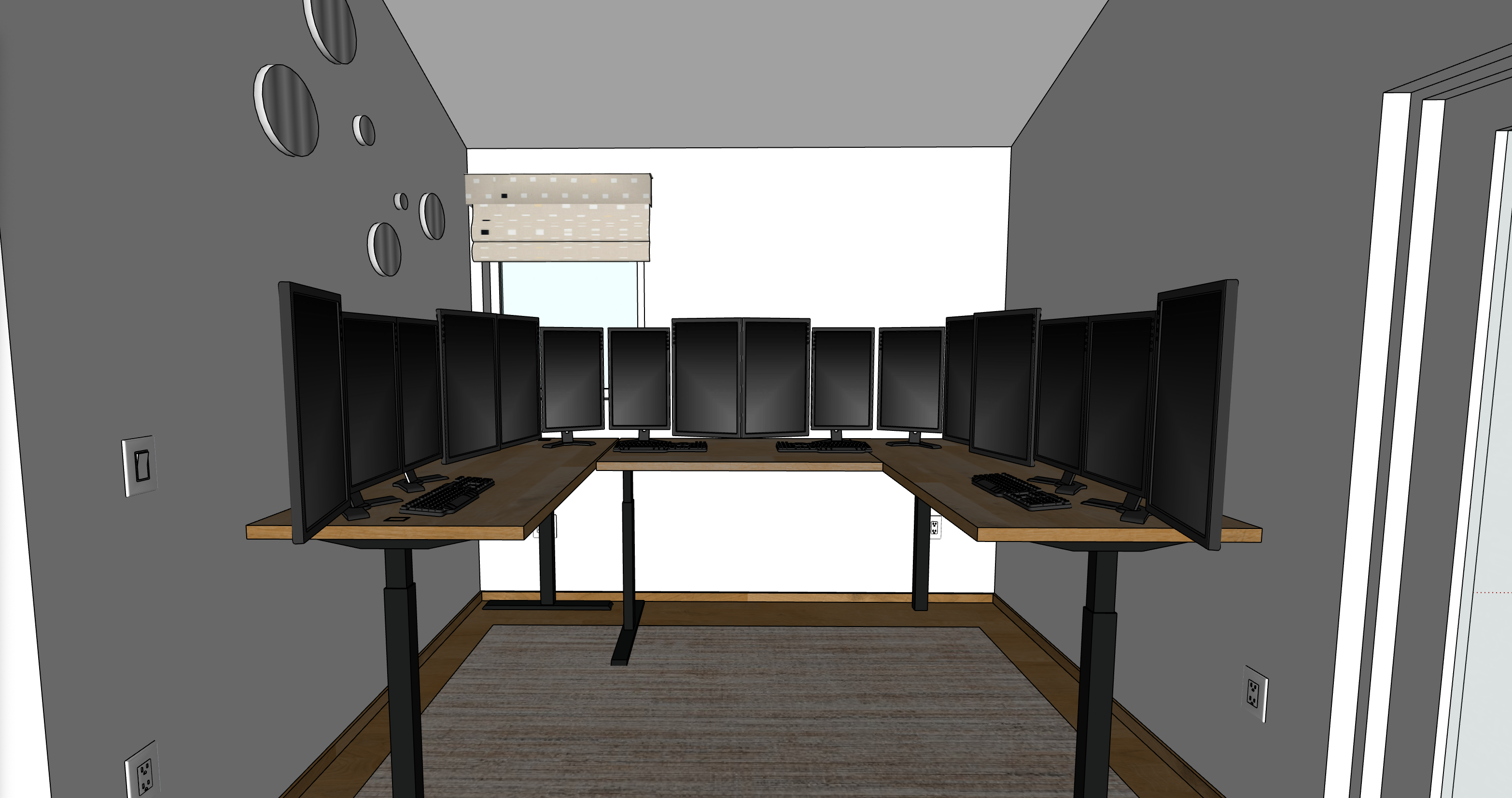 render in a realistic way with natural light raking in from the left window and french door on right the standing desk tops are natural white oak the walls are white the french door has no panes in the glass and the circle sculptures on the wall have rounded edges and are reflective mercury glass