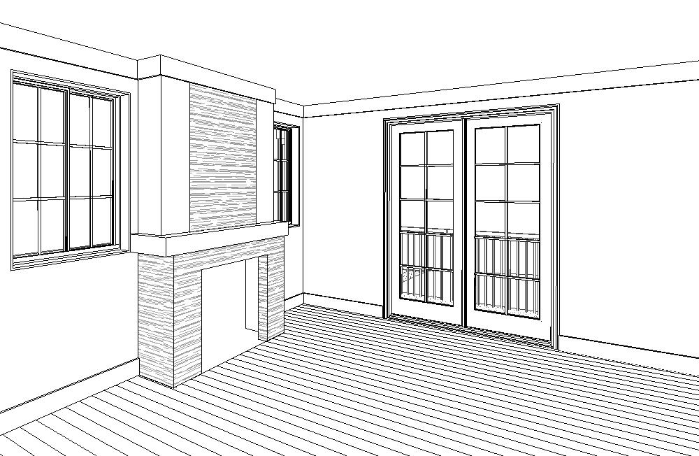 interior elevation of a traditional farmhouse style fireplace with stacked arizona stone rustic barn wood beam lintel dunn edwards cool december white painted walls white painted crown and base molding walnut wood plank flooring abundant natural light entering through the windows with white window frames green vegetation outside