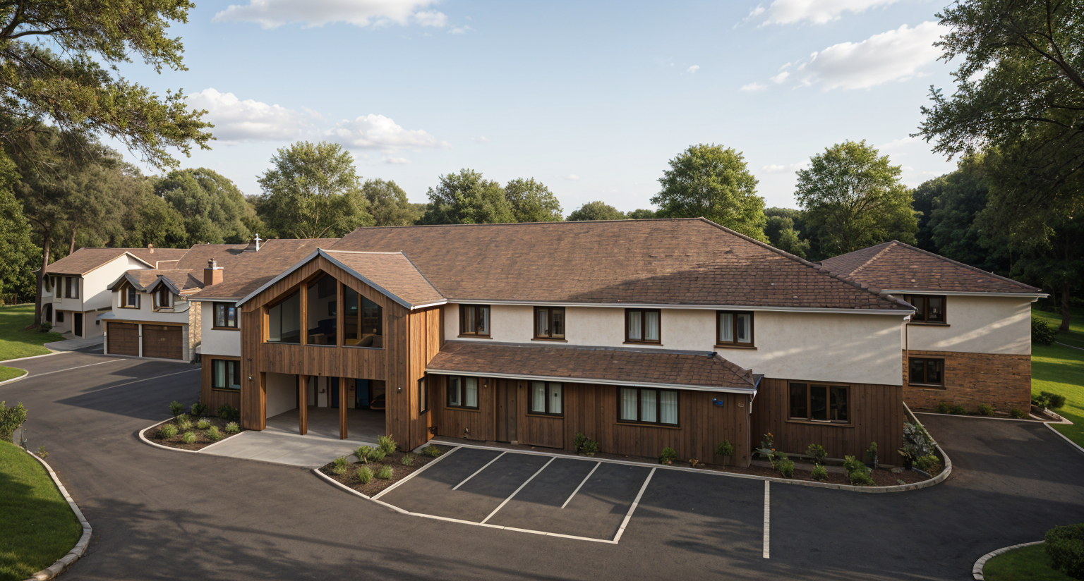 outdoor view shopping center sand stone facade palm trees green roof architecture