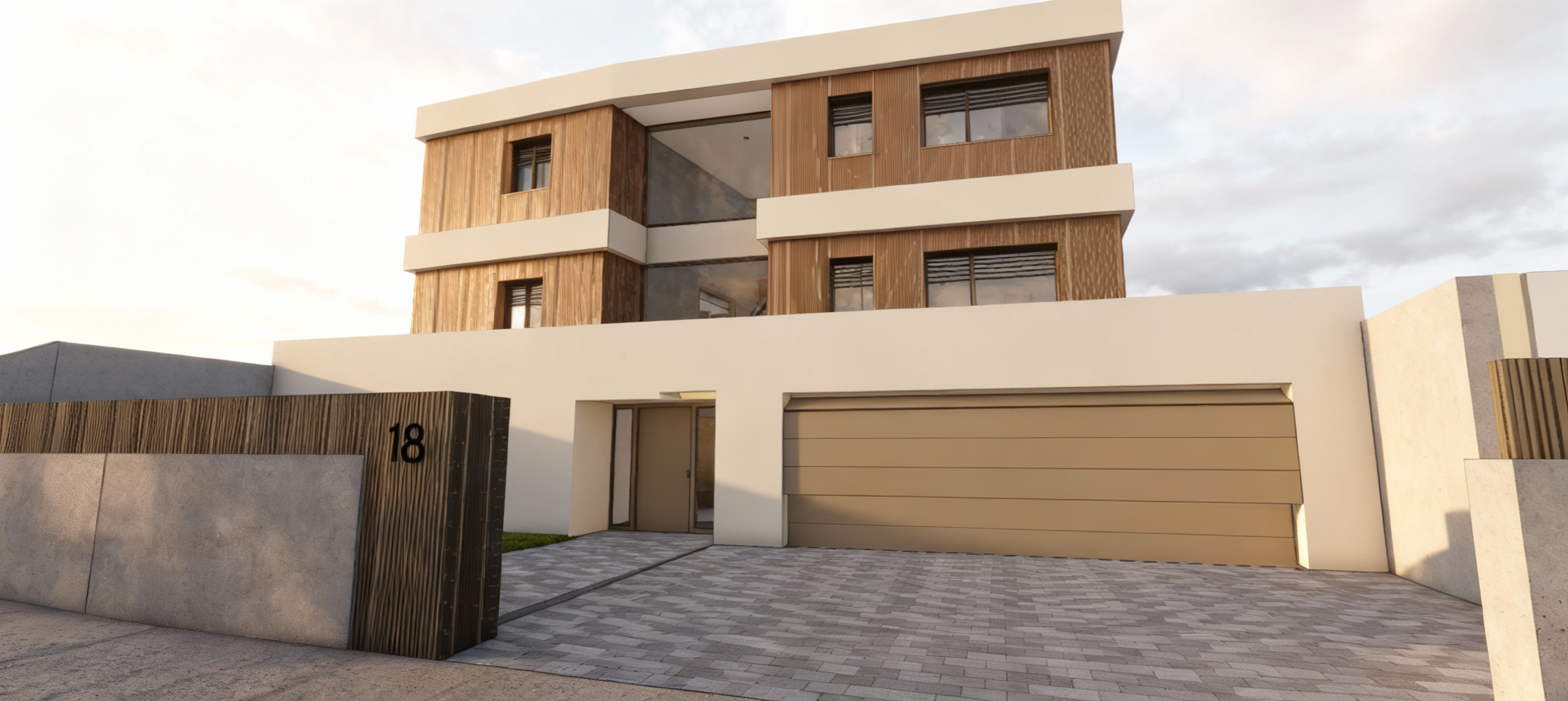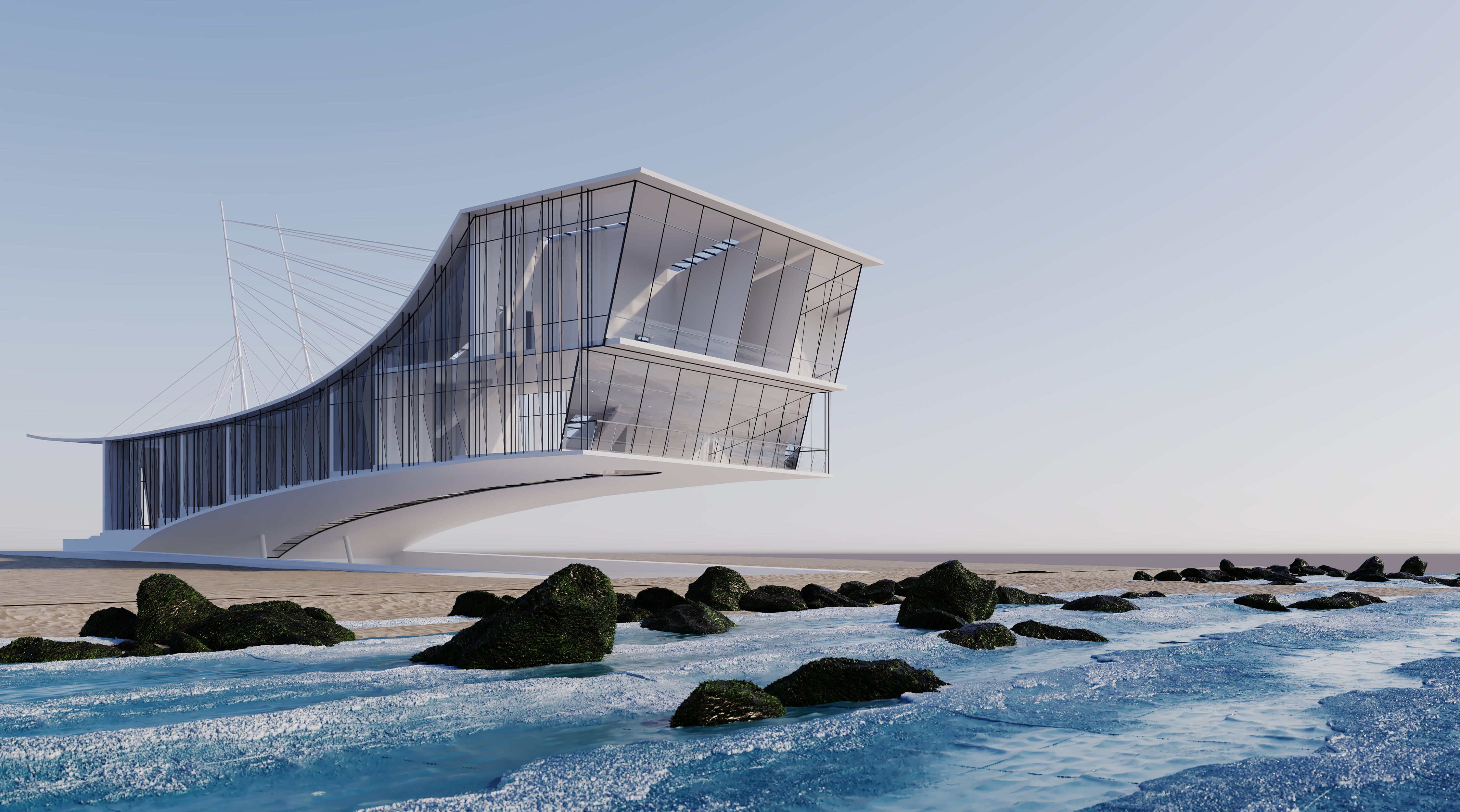 modern exterior shot sea house with far city skyline extended to horizon architecture