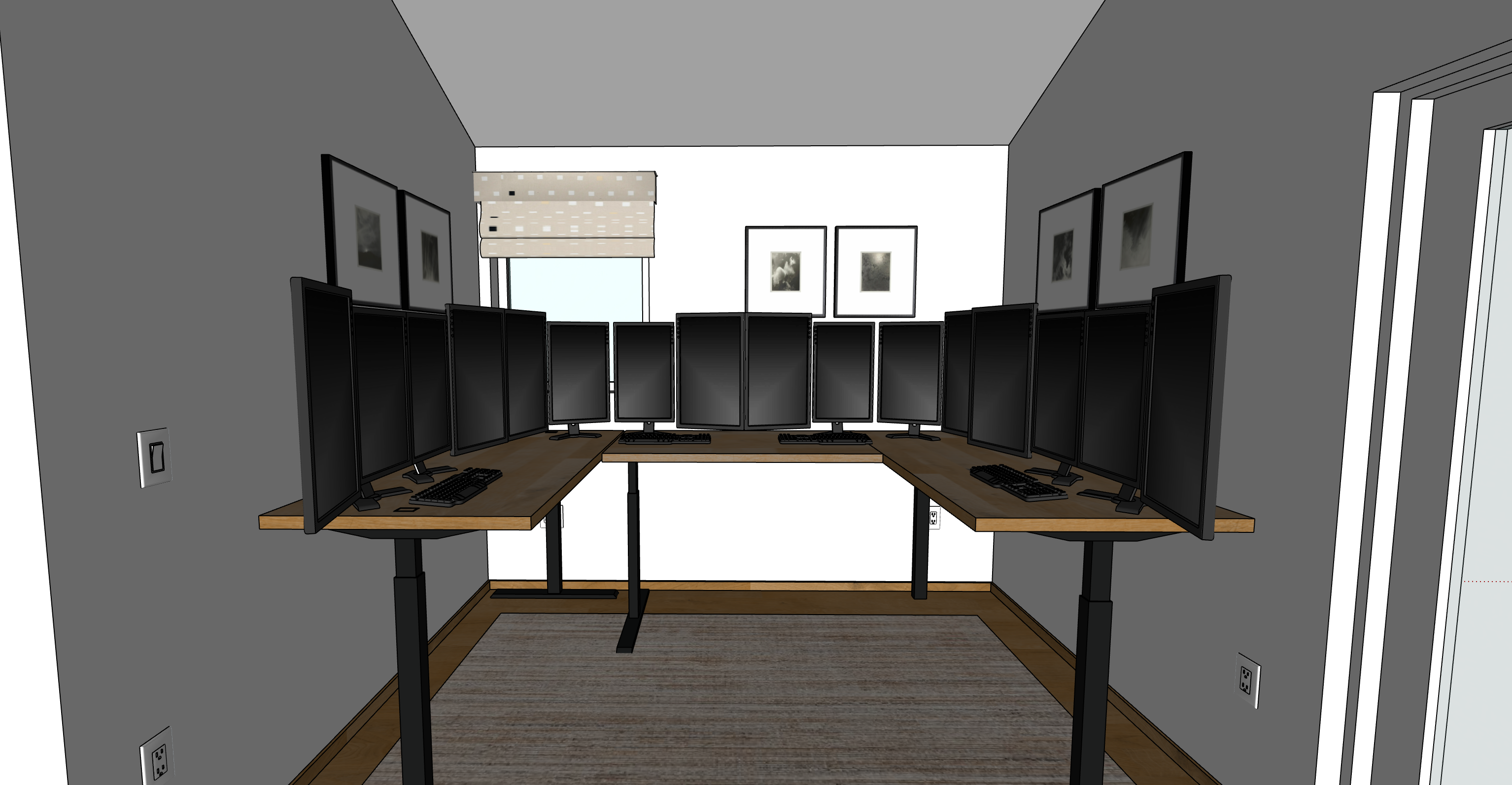 render in a realistic way with natural light raking in from the left window and french door on right the standing desk tops are natural white oak