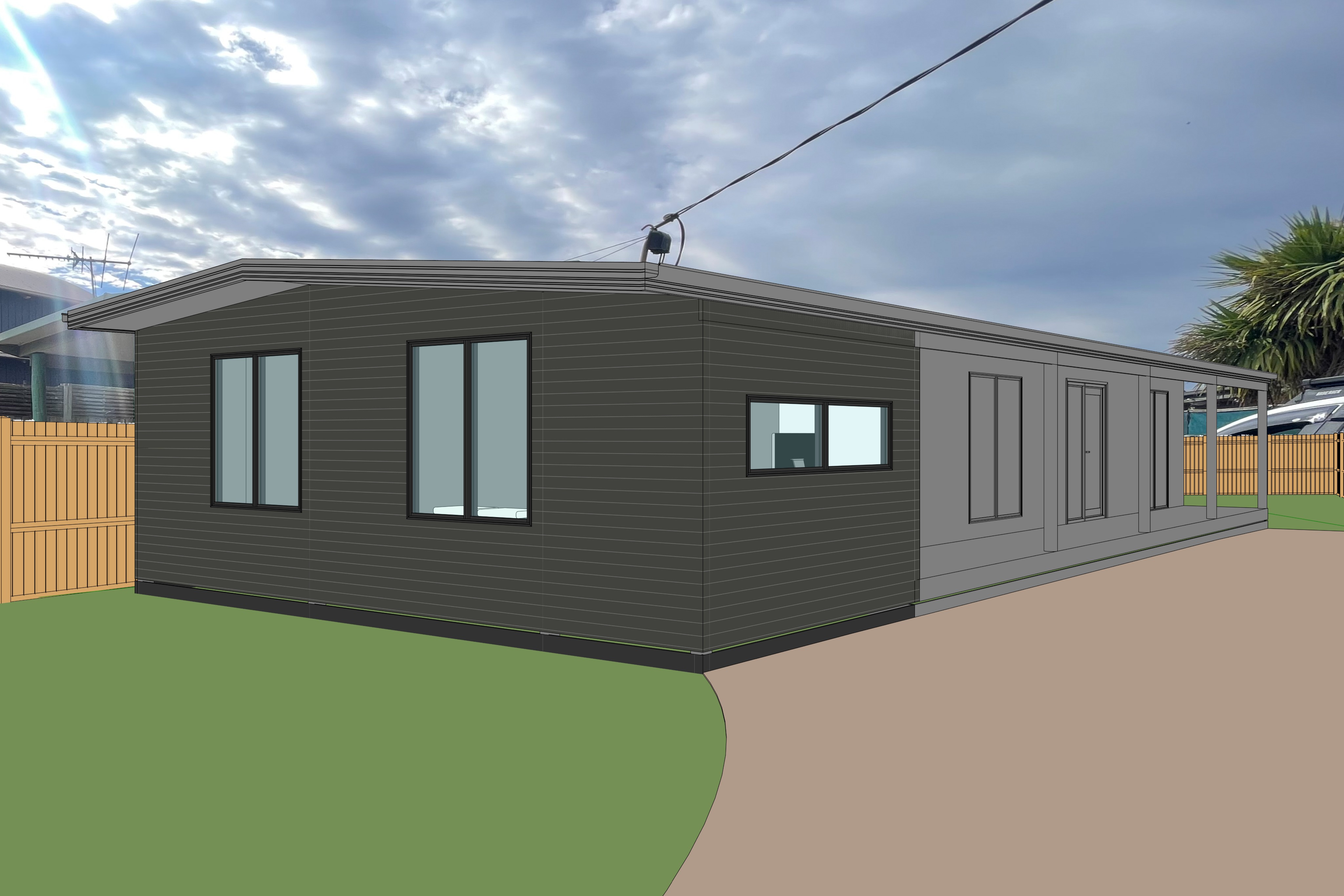 renovations to be highlighted to a house the front part of the house in black in cladded with horizontal colorbond corrugated iron the gray part of the house is existing to be faded from the image gravel driveway and native landscaping in the front garden timber paling fence enclosing property with neighboring two story house to the left hand side partly cloudy sky