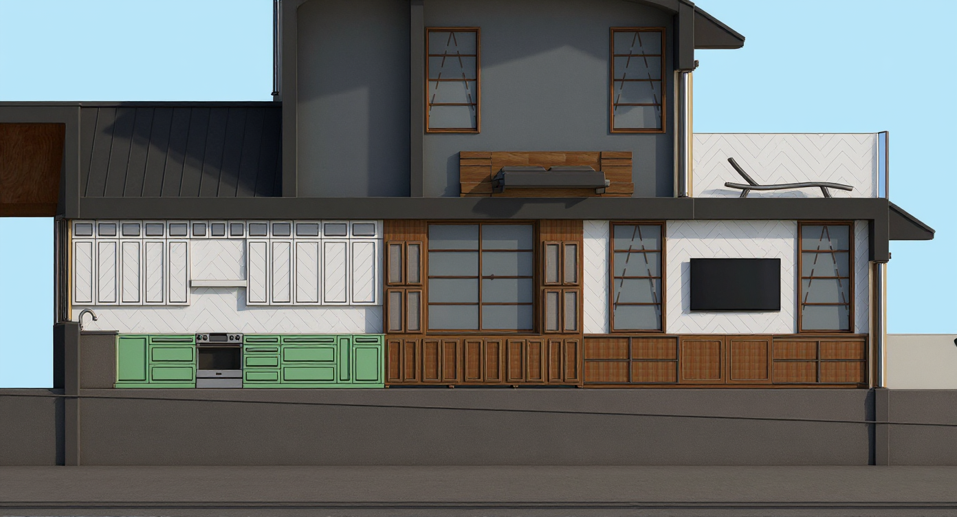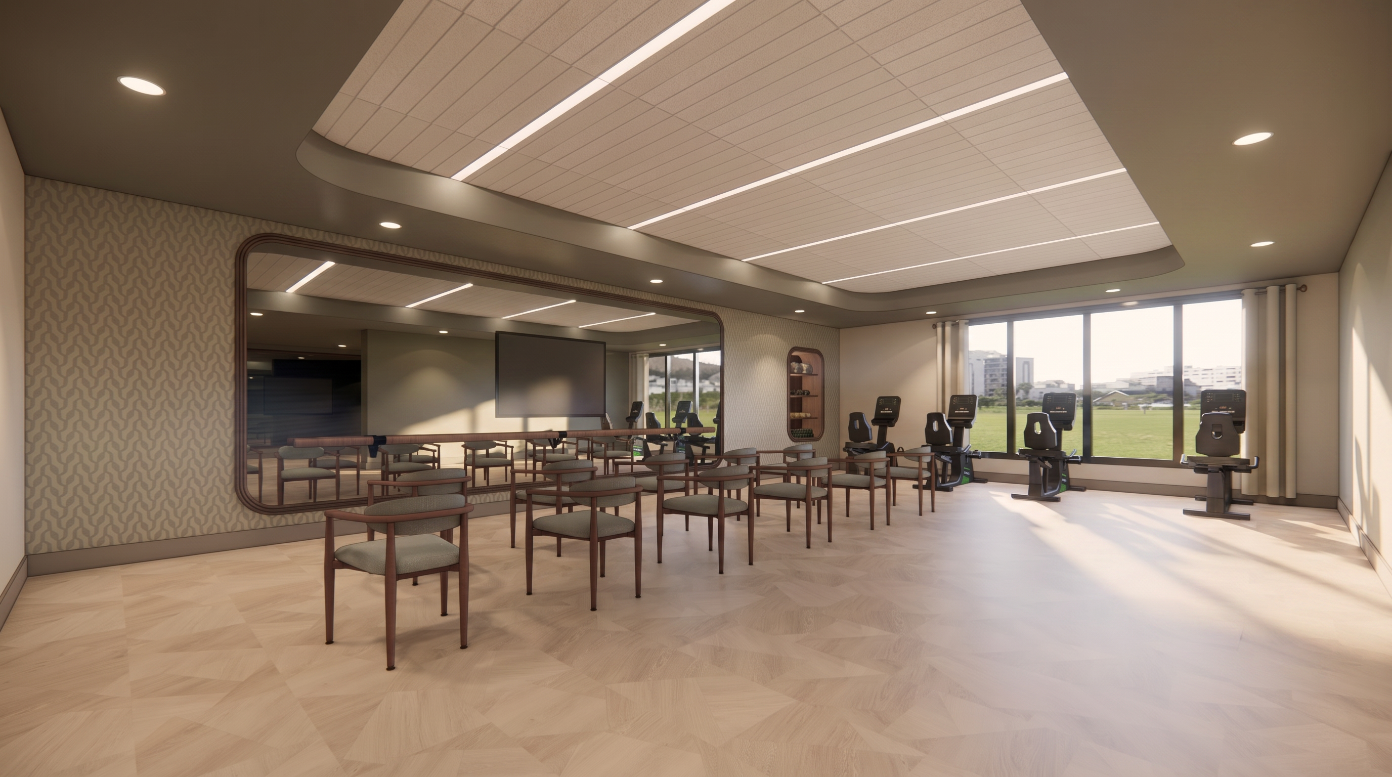 keep everything the same the floors are a mahogny wood the left and right walls have beige grasscloth wallpaper the outside environment has annabelle hydrageas and a yard the ottoman has a rust brown velvet the cabinet on the left has some books and decor on it the rug is a grey and brown color and keep the pattern the mirror on the left is a brass