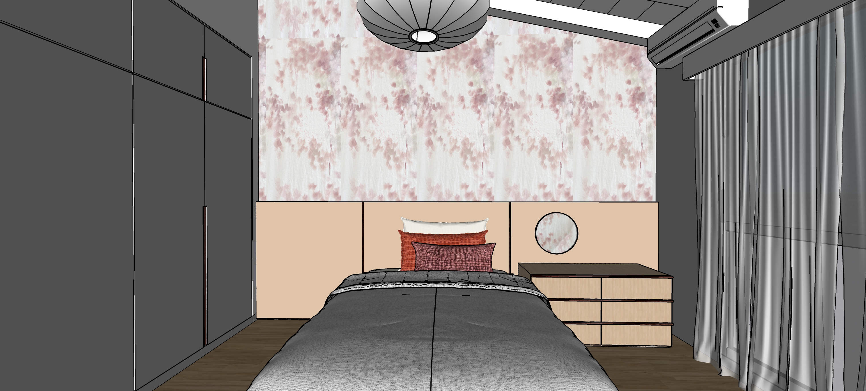 generate a photorealistic render from this image preserving the exact morphology arrangement and colors of the furniture curtains and objects keep the same design without changes but enhance realism through textures lighting and shadows headboard respaldo melamine himalaya from faplac with a smooth satin texture back wall light fixture area pared de atr s aplique painted finish with artistic brushstroke effect soft tones in harmony with the current palette wardrobe placard painted in sherwin williams sw7044 with a matte finish and subtle light reflections curtains sheer fabric semi translucent stopping just above the floor not reaching the wall with soft folds and daylight passing through naturally bedding cotton linen blend with realistic fabric folds neutral gray tones and detailed texture wooden furniture nightstand and headboard panels natural light wood with a satin finish and visible grain lighting introduce natural daylight entering from the right window softened with warm ambient lighting to create a cozy and professional look the final result should look natural warm and highly detailed enhancing realism in all surfaces without altering the design or existing palette