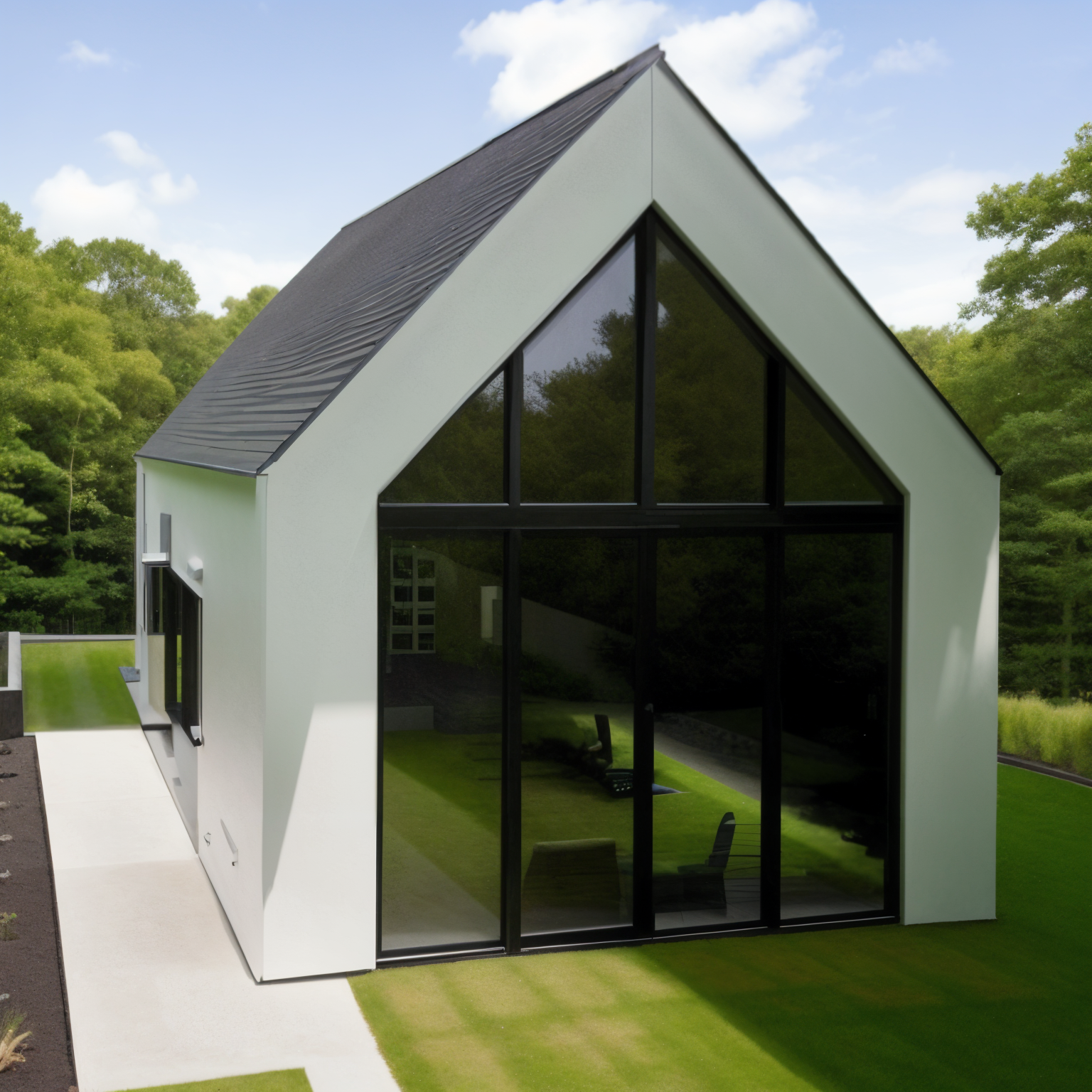 cottage with facade made of corrugated sheet metal on meadow in valley with hills in background architecture