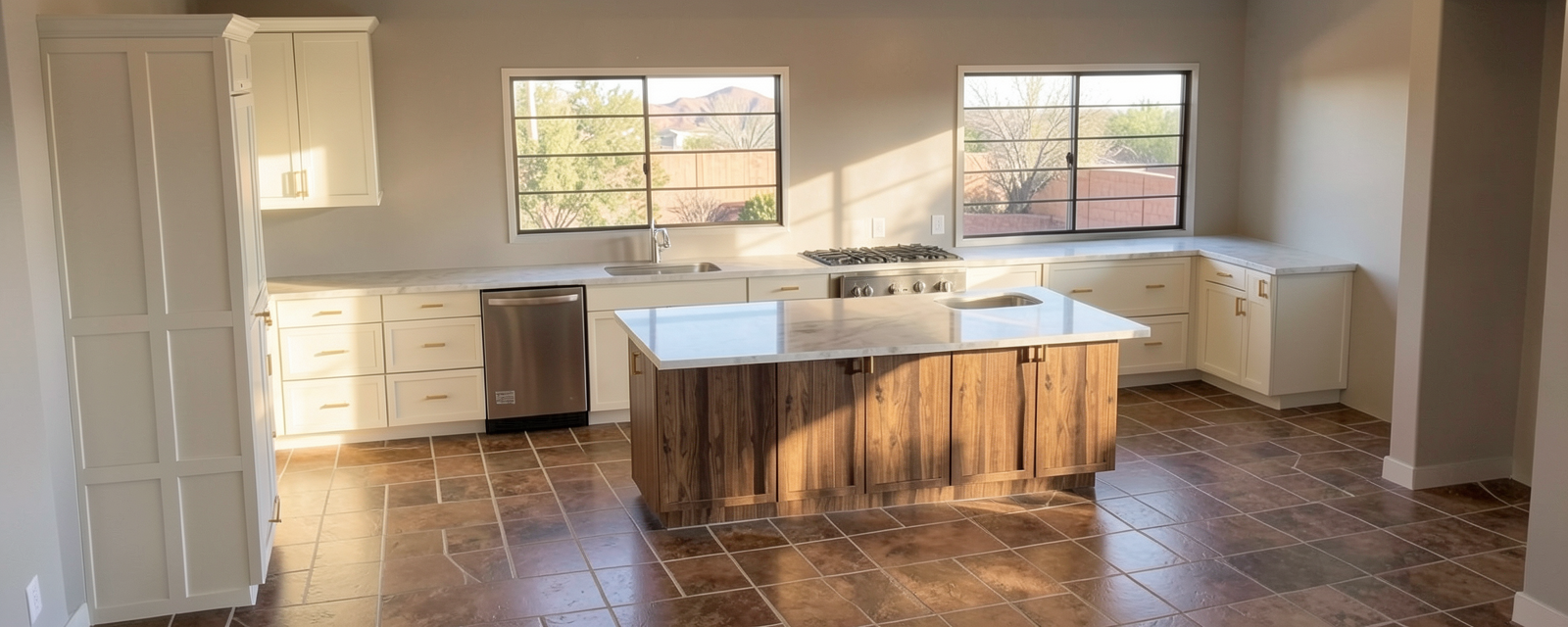 render a modern kitchen interior with sleek matte beige colored cabinetry use a white marble backsplash with subtle beige veins to add elegance incorporate a minimalist black sink faucet on the right and a contemporary black oven on the left the flooring is smooth gray adding a modern touch the atmosphere is clean minimalist and luxurious with soft ambient lighting enhancing the dark and light color contrasts