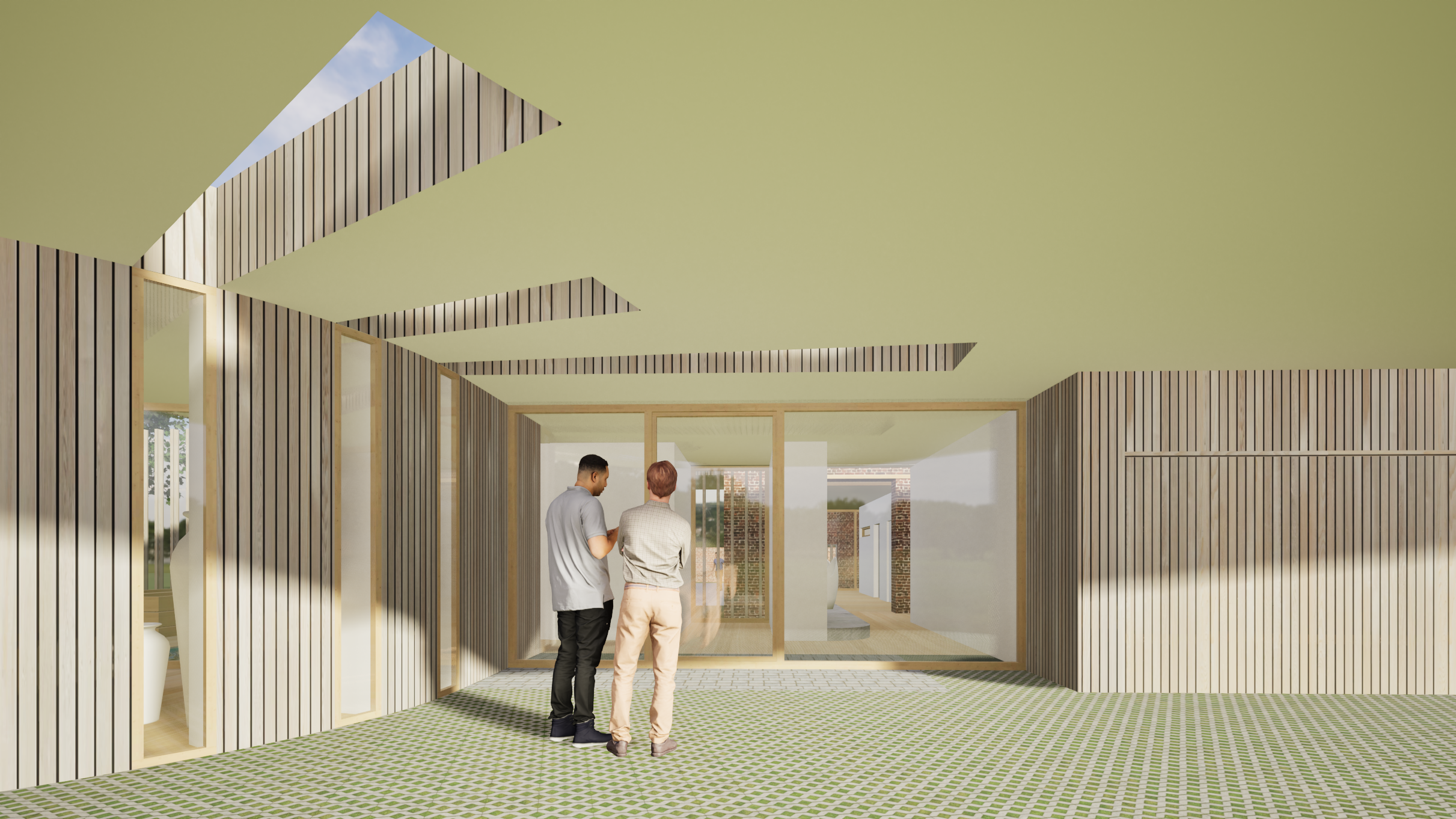 work as if you were a professional in creating 3d renders for architectural projects without changing anything in the original image make the visual of the new construction more realistic finally adjust the grain and lighting of the image to make it more cinematic leave the wood cladding rendering as is use the same colors as for the other renderings the ground consists of concrete grass paver