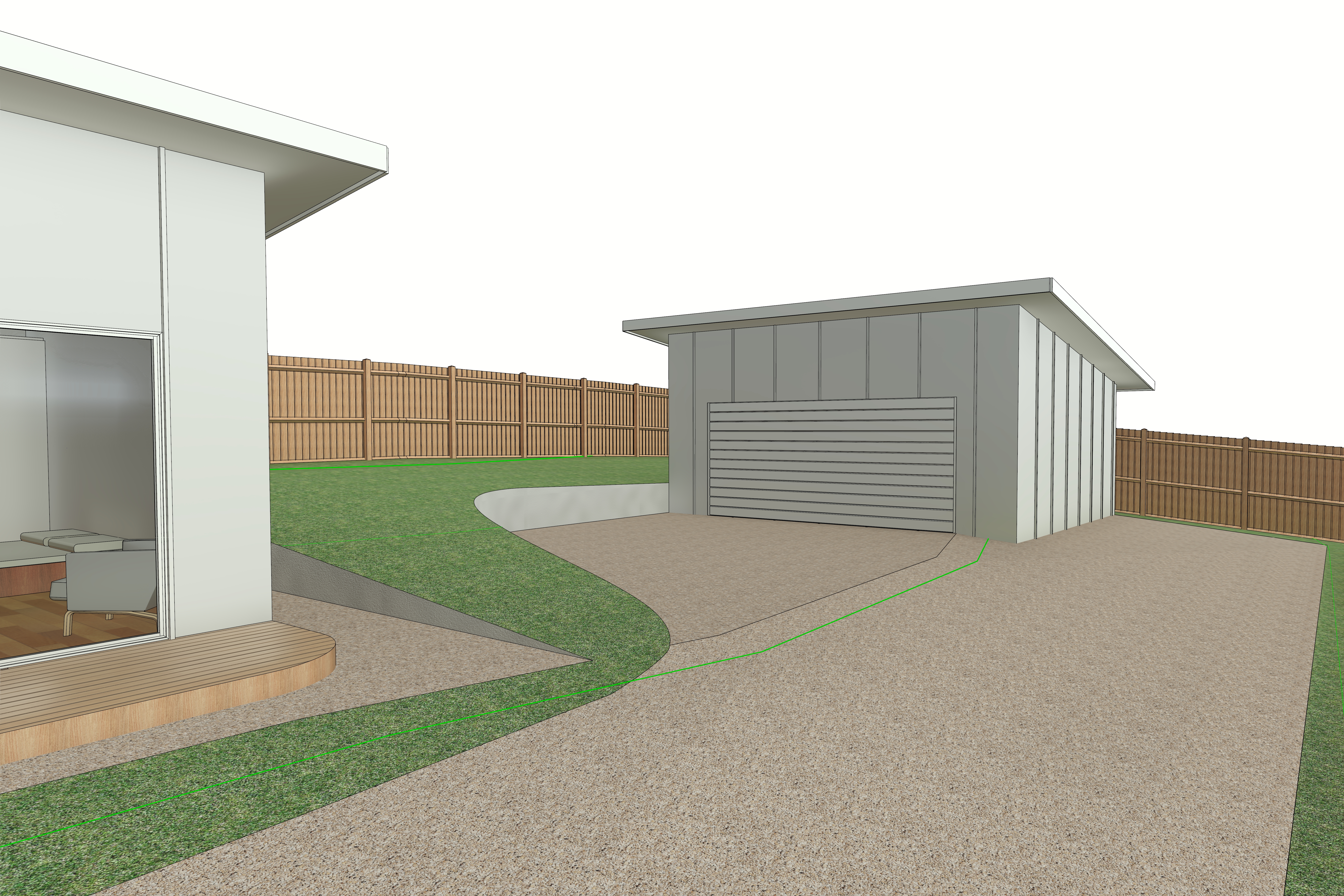 keep the geometry of the existing image modern palm spring style home smooth board and vertical battens every 900mm white keep the scene warm lit with all white exterior and warm interior where visible landscaping around the dwelling should be native australian planting large gum trees behind the dwelling with partly cloudy sky with morning sunlight lighting the face of the dwelling large trees filling background