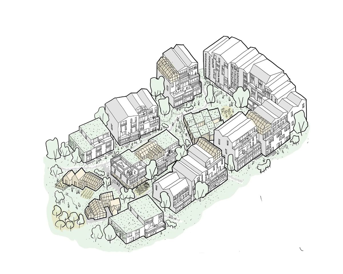 exterior shot turn this aerial photo into hand sketch via moodboard