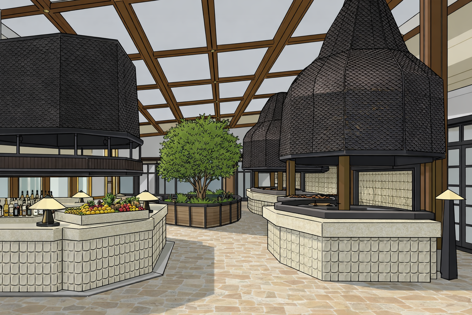 interior of a maldivian courtyard restaurant with a high geometric wooden weaved ceiling warm and inviting atmosphere the ceiling beams are rich textured brown evoking a sense of natural warmth the central bar area is made of smooth beige stone with subtle texture topped with a vibrant array of colorful tropical fruits like oranges limes and pineapples banana the bar is highlighted with soft ambient lighting from elegant lamps with cream colored linen shades nearby elegant brick structures feature dark textured bronze scale surfaces lush green tall tree add a lively fresh touch amidst the stone large mosaic floor tiles of varied beige and earth tones completing a harmonious sophisticated setting
