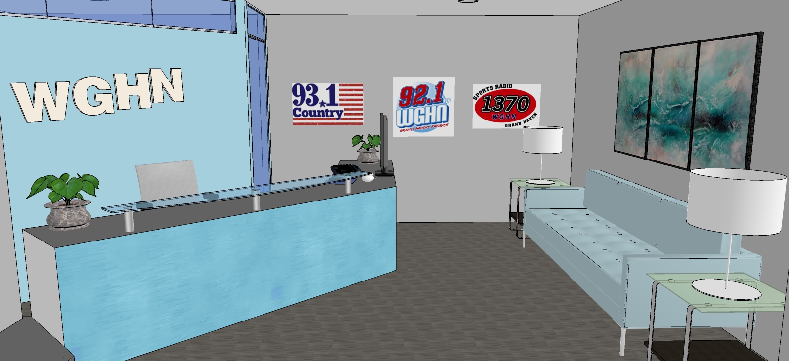 make a photorealistic rendering of this office there is not natural light provide warm diffused light by means of the lamps