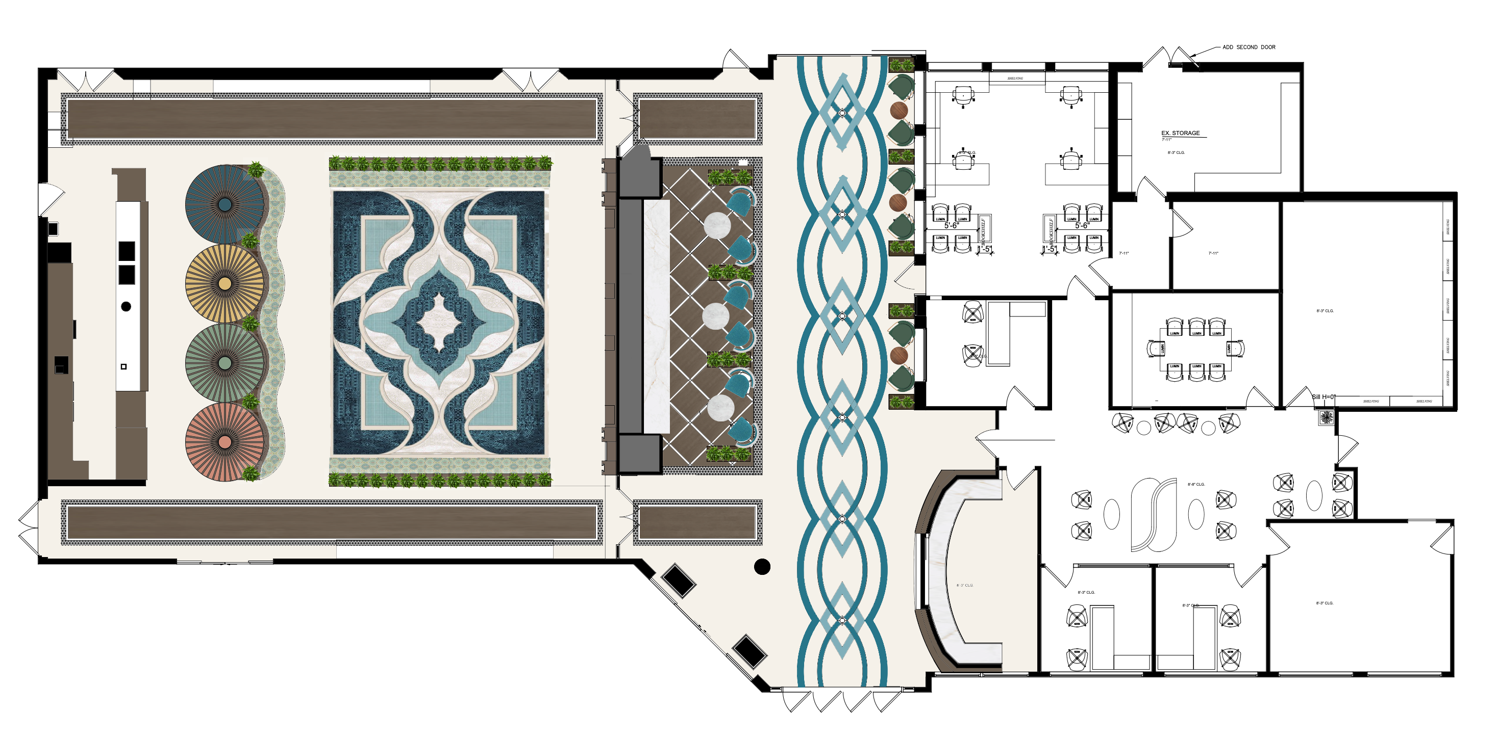 convert this floor plan into a realistic isometric 3d view of a full house show the space from an elevated angle with furniture walls and details visible round colored shapes are wood domes the main flooring is beige tile with accent carpet tile use the same furniture as shows on the plan do not change the orientation of the floorplan