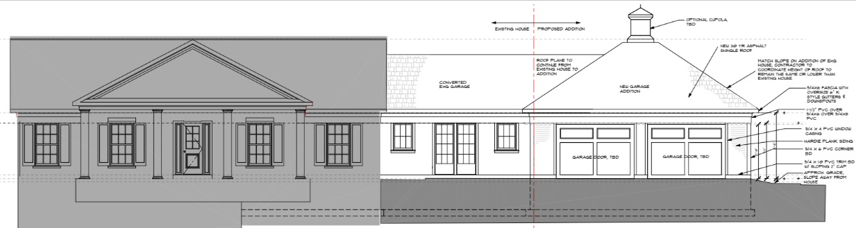 exterior elevation of a all white house with clouds in the sky and big trees in the background