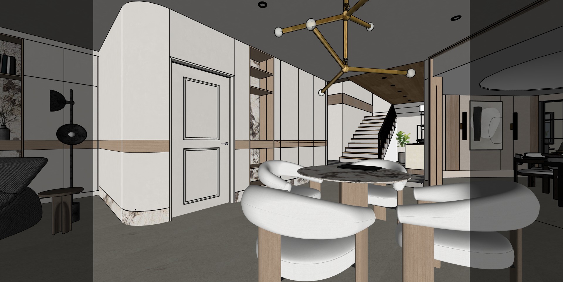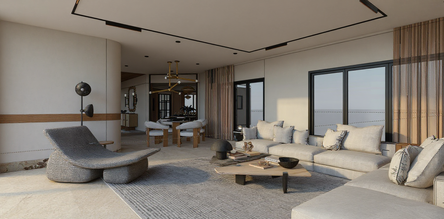create a beautifully rendered modern living area use a soft warm color palette with ecru matte flooring the walls should be a sophisticated light grey and the cabinetry in ecru with wood accents keep concave panels on tv back wall incorporate black metal accents in the furniture and fixtures for a chic contrast ensure the atmosphere feels inviting and cozy with soft lighting to enhance the warm homely ambiance keep all original color of materials add subtle sunlight turn on lights add lights on cabinet shelves add textile texture on upholstered chairs
