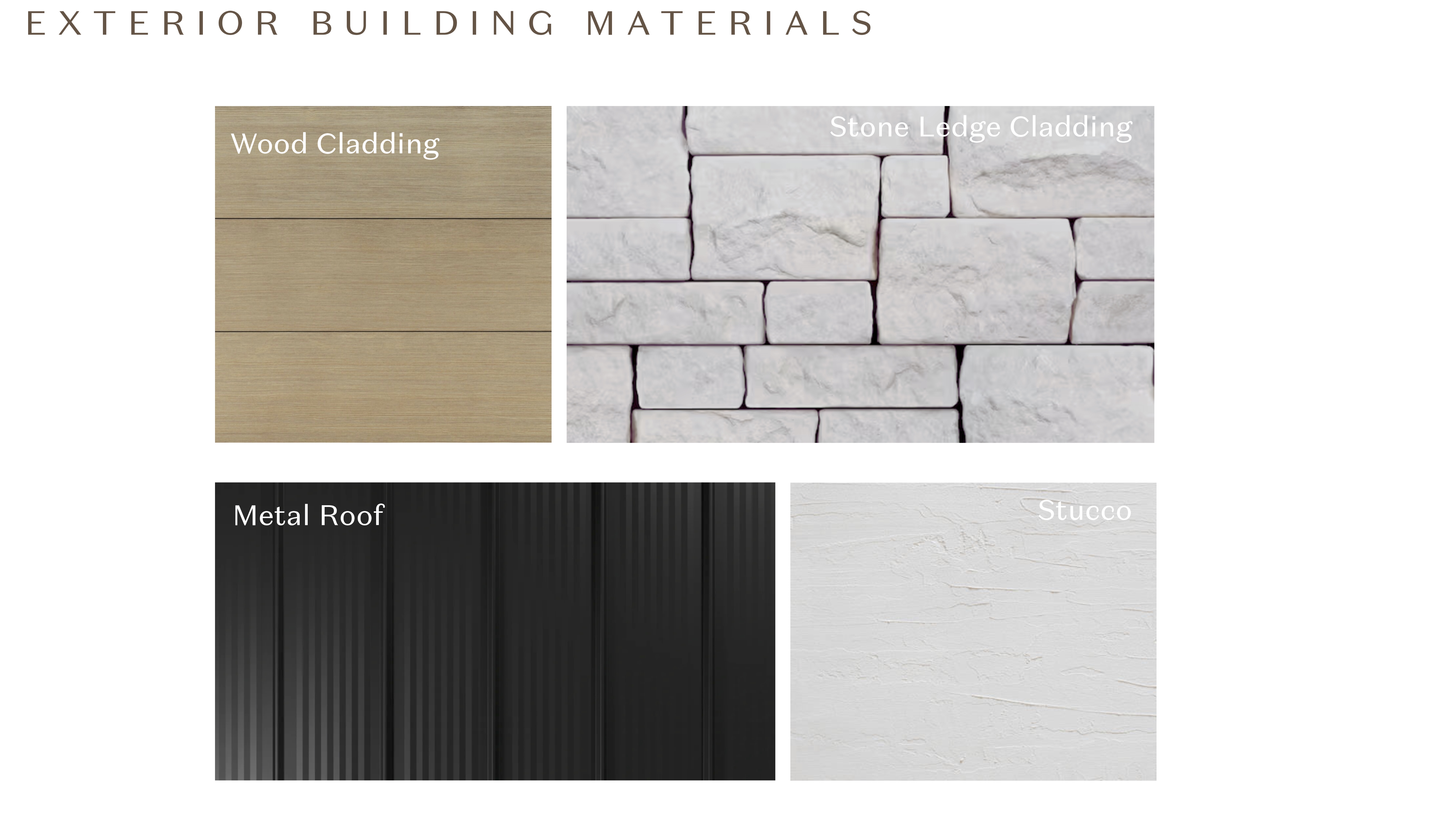 exterior shot keep the structure of the home the same do not change anything structurally only apply exterior materials from the mood board the metal roof goes on the center mass that has an angled roof to it all of the flat roofs will have the white stucco we are only applying wood and stone cladding to the front masses the very left mass is a garage place a black metal garage door on this mass along with the stone ledge cladding for the walls the next mass to the right has a picture window and outdoor deck attached above the one story mass is attached to the big center mass that has the angled roof and entry door these two masses will be in the white stucco the next mass to the right also has a small window this mass will have the stone cladding the last building all the way to the right is a smaller garage also place a black metal garage door here this mass will be in white stucco create a u shaped driveway that access both garages this home is in the suburbs in scottsdale arizona